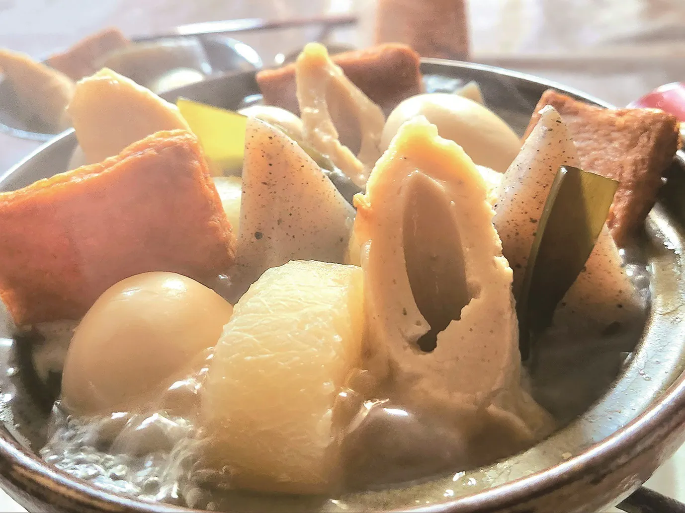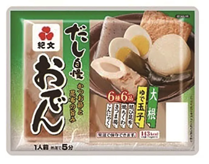 町内に工場がある、紀文食品様のおでんパックになります。かつお節と昆布のうまみを聞かせた6種のだし自慢おでんです。