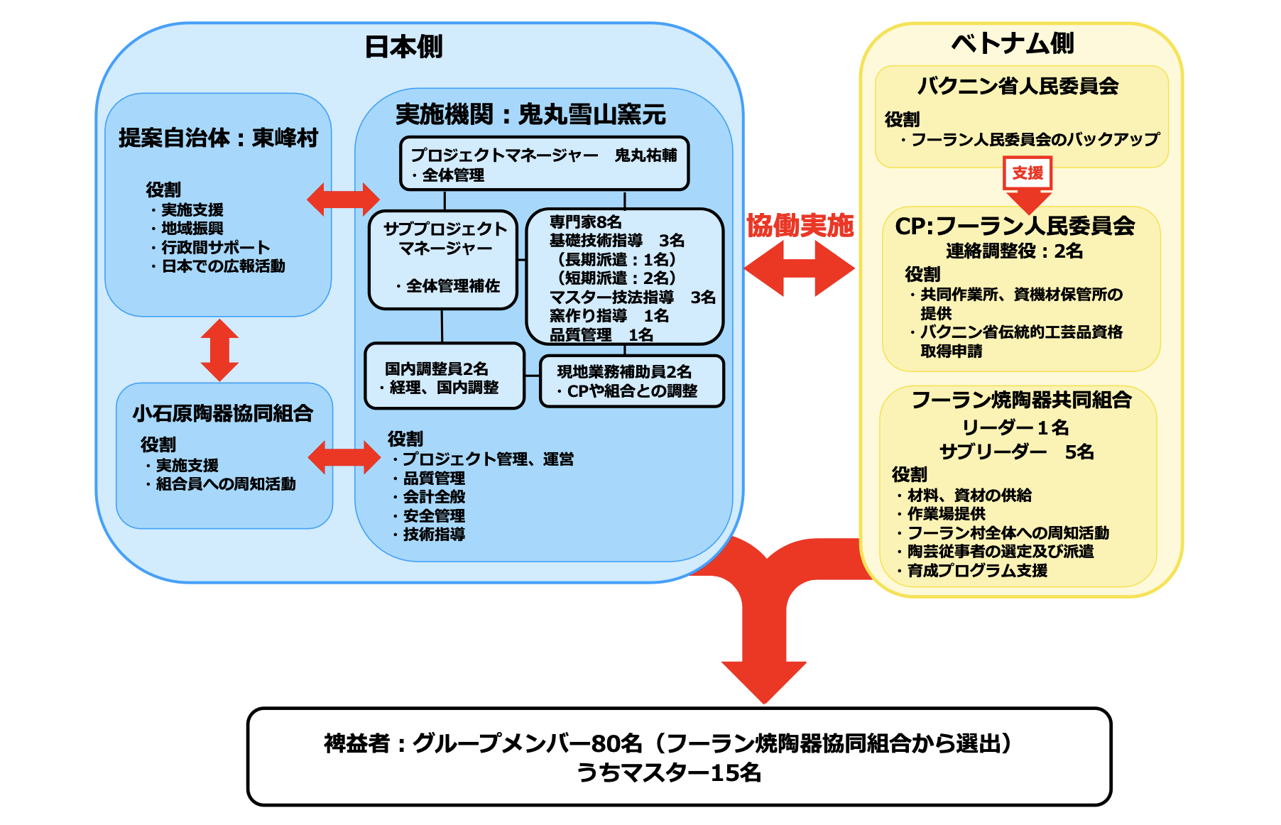 最終的なゴールとして、フーラン村のマスターを中心にベトナム北部陶芸地域の中核的な陶芸産地になり、ベトナム国内需要、観光客向け需要、そして海外での評価および需要を取り込むだけでなく、自然との調和、伝統・技術の継承など後世の子ども達に残すべきものを残せるようになってもらいたい。そして何よりも日本および小石原との交流の拠点となること願っています。