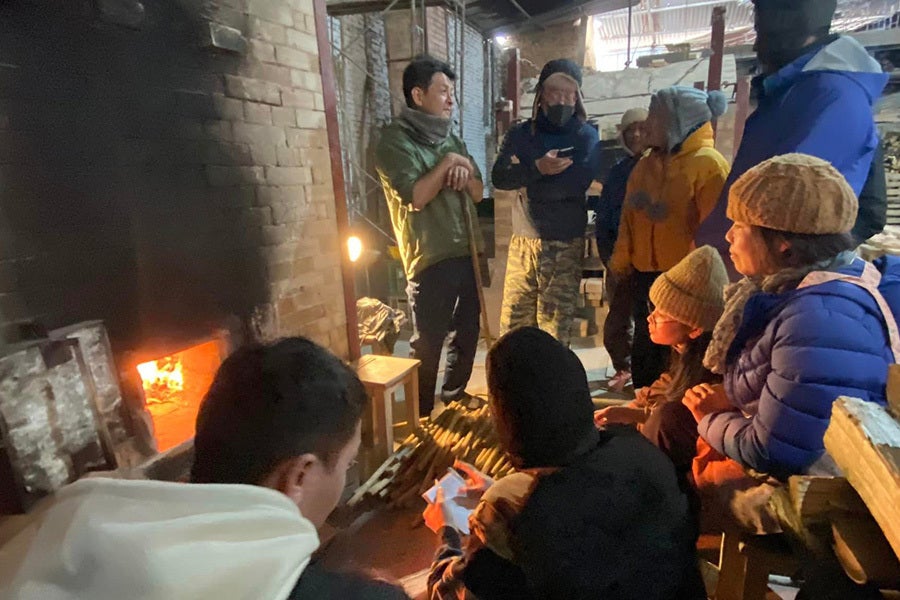 ● 窯炊き実習中の鬼丸碧山とフーラン焼マスターたち
