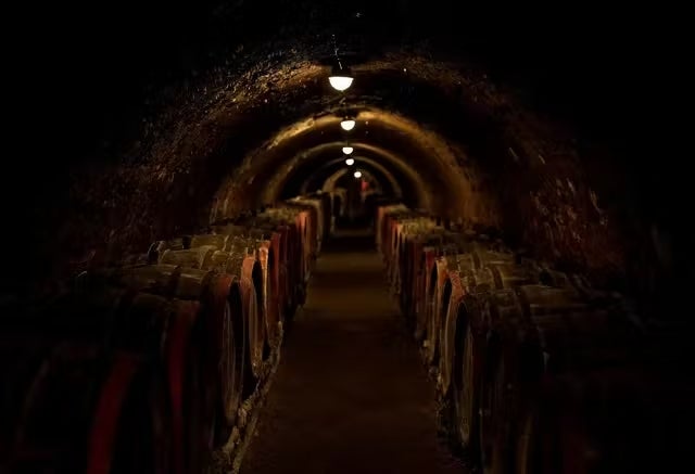 Kissさんの隣にある石積みの建物に入り、長い階段を下りて行った先にセラー内の写真です。通路が縦横無尽にめぐり、両側には多くの樽が置かれています。