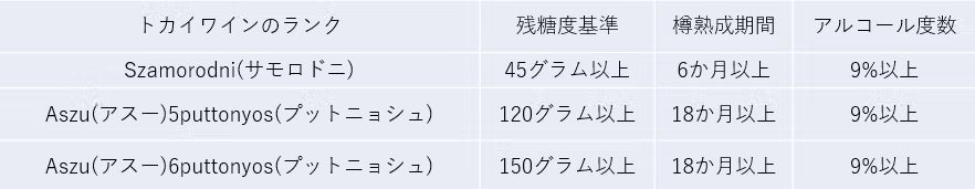 つまり、aszuを名乗っている以上、120グラム以上の残糖度が保証されるのです。しかも、aszuの中にも5puttonyosと6puttonyosという2つのランクがあり、6puttonyosは上記の表のように150グラム以上の残糖度がないと名乗れません。また、樽熟成期間や最低アルコール度数も決まっています。