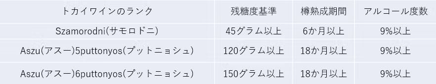 つまり、aszuを名乗っている以上、120グラム以上の残糖度が保証されるのです。しかも、aszuの中にも5puttonyosと6puttonyosという2つのランクがあり、6puttonyosは上記の表のように150グラム以上の残糖度がないと名乗れません。また、樽熟成期間や最低アルコール度数も決まっています。