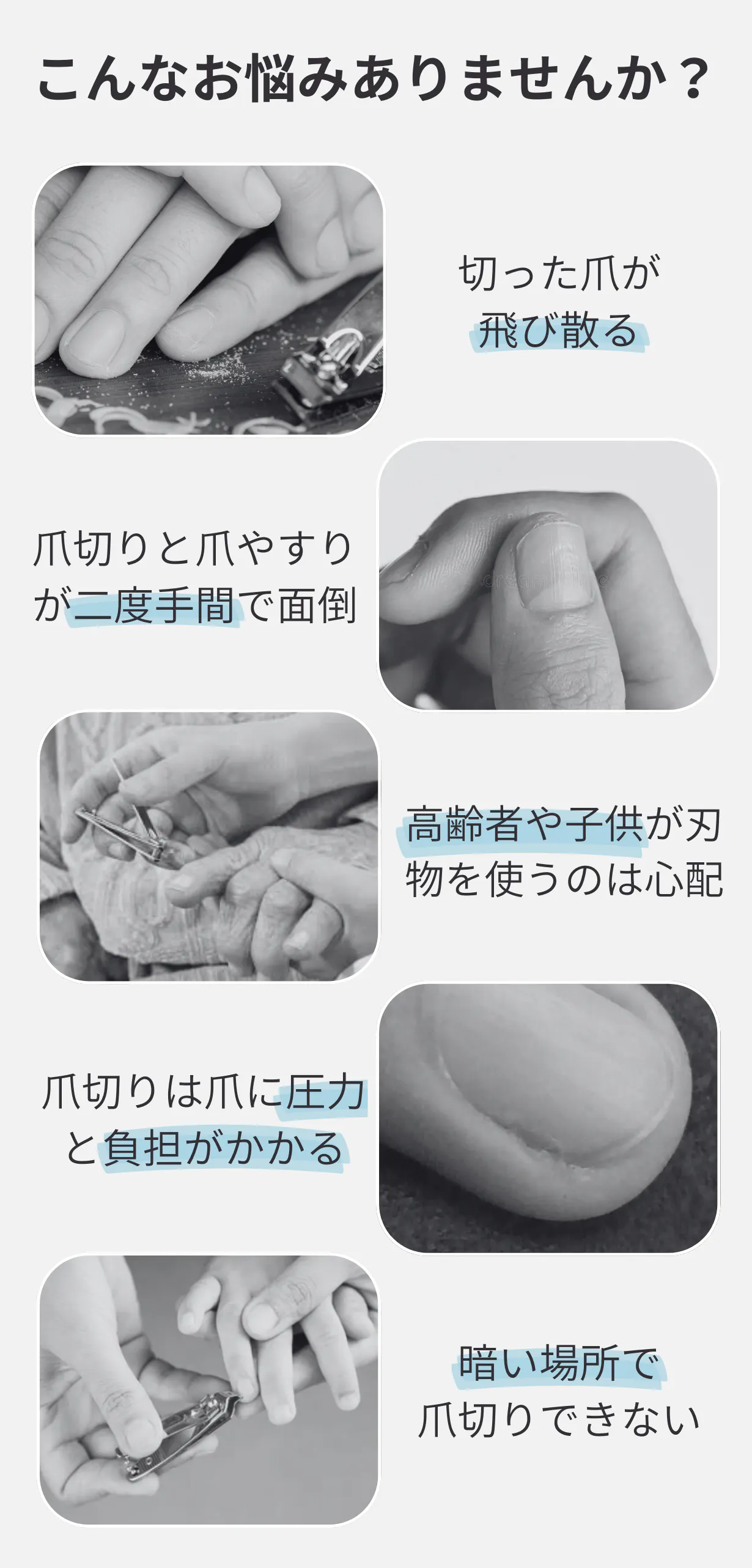 日常でも子供の爪切りで深爪をさせてしまう心配もなくなり、暗い場所でも危ないと思った時にすぐ爪を整えることができるので、危険な場面が減りました。