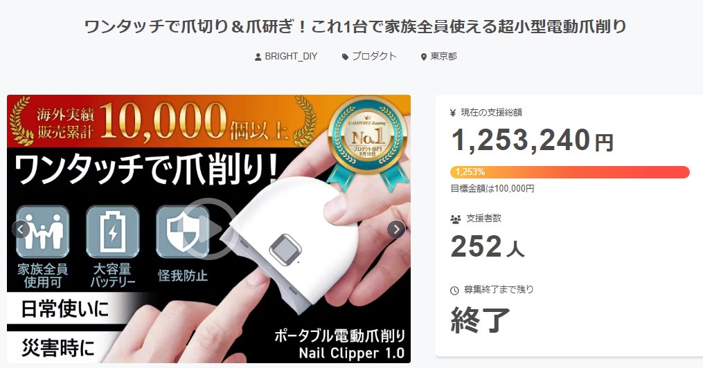 ご支援者様、ワンタッチで爪切り&爪研ぎ!これ1台で家族全員使える超小型電動爪削りにご興味をお持ちいただきありがとうございます。プロジェクト開始から36日目で252人ものご支援者の方々より支援頂き、無事プロジェクト終了を迎えることが出来ました。早速皆様のリターンを2024年12月末にお届けできるよう準備を始めております!皆様にご満足いただけるリターンをお届けできるよう、全力で取り組んで参りますので引き続き、「ワンタッチで爪切り&爪研ぎ!これ1台で家族全員使える超小型電動爪削り」をよろしくお願い致します。BRIGHTチーム