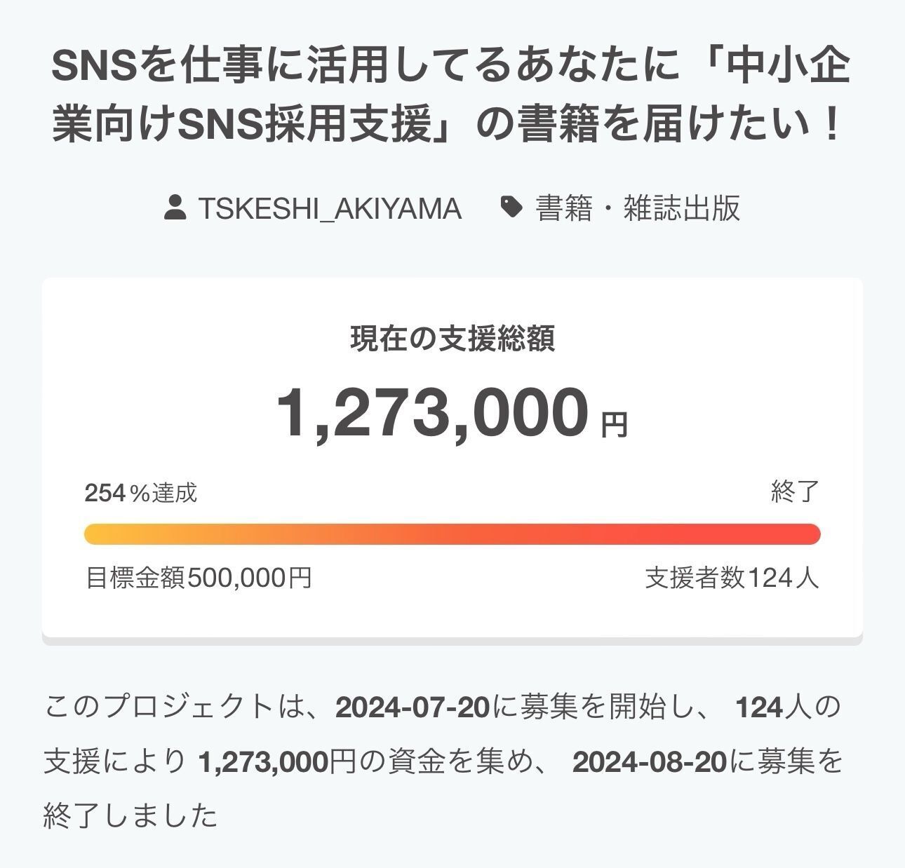 このプロジェクトは、2024/07/20に募集を開始し、 124人の支援により 1,273,000円の資金を集め、 2024/08/20に募集を終了しました