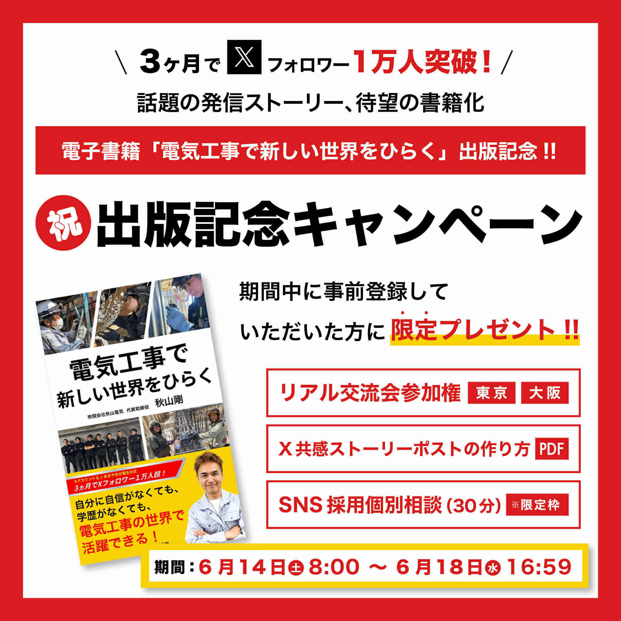 秋山剛です。いま、AIの進化でホワイトカラーの仕事が激変する時代が始まっています。そんな中で、「手に職をつけて生きる」現場の仕事がこれから大きく見直されようとしています。僕自身、学歴も夢もなく何者でもなかった20代の頃、電気工事の仕事に出会って人生が変わりました。仲間ができ、技術が身につき、そして、いまでは“発信”を通じて会社も採用も変えることができました。この本には、そんな僕のリアルな体験と、現場仕事が未来を変えるチカラを込めています。『電気工事で新しい世界をひらく』明日6月23日(日)まで、無料で読めます。▼ダウンロードはこちらhttps://akiyamadenki-e.com/lp/book-campaign/ぜひ読んでいただけたら嬉しいです。若い世代にも「現場ってカッコいい」と伝わってほしい。そんな想いで書いた一冊です。