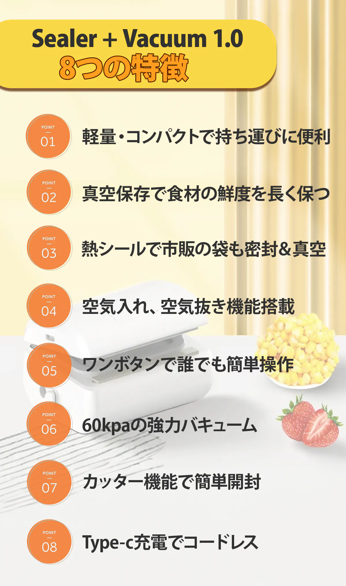 Sealer Vacuum 1.0 は-60Kpaの強力な吸引力で袋から空気を簡単に除去することが出来ます!