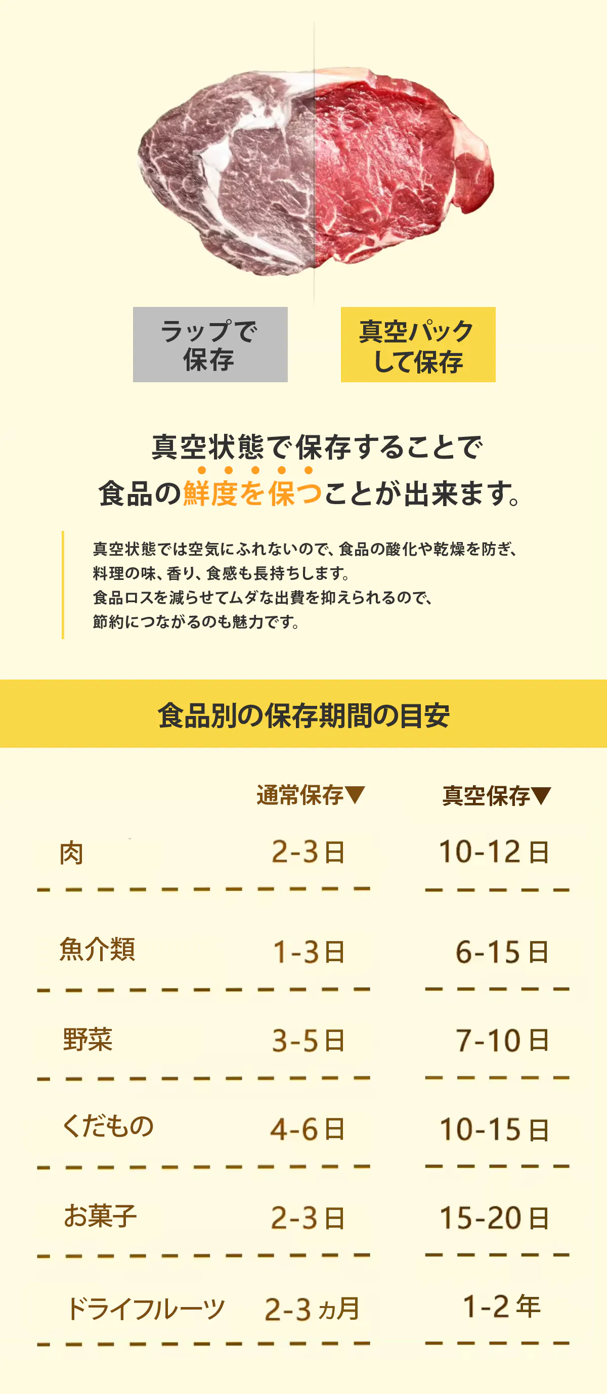 Sealer Vacuum 1.0 は肉や魚などの生鮮食品から、スナックや調味料など様々な食品の保存に使用でき、通常保存よりも長い期間で鮮度を保つことが出来ます。