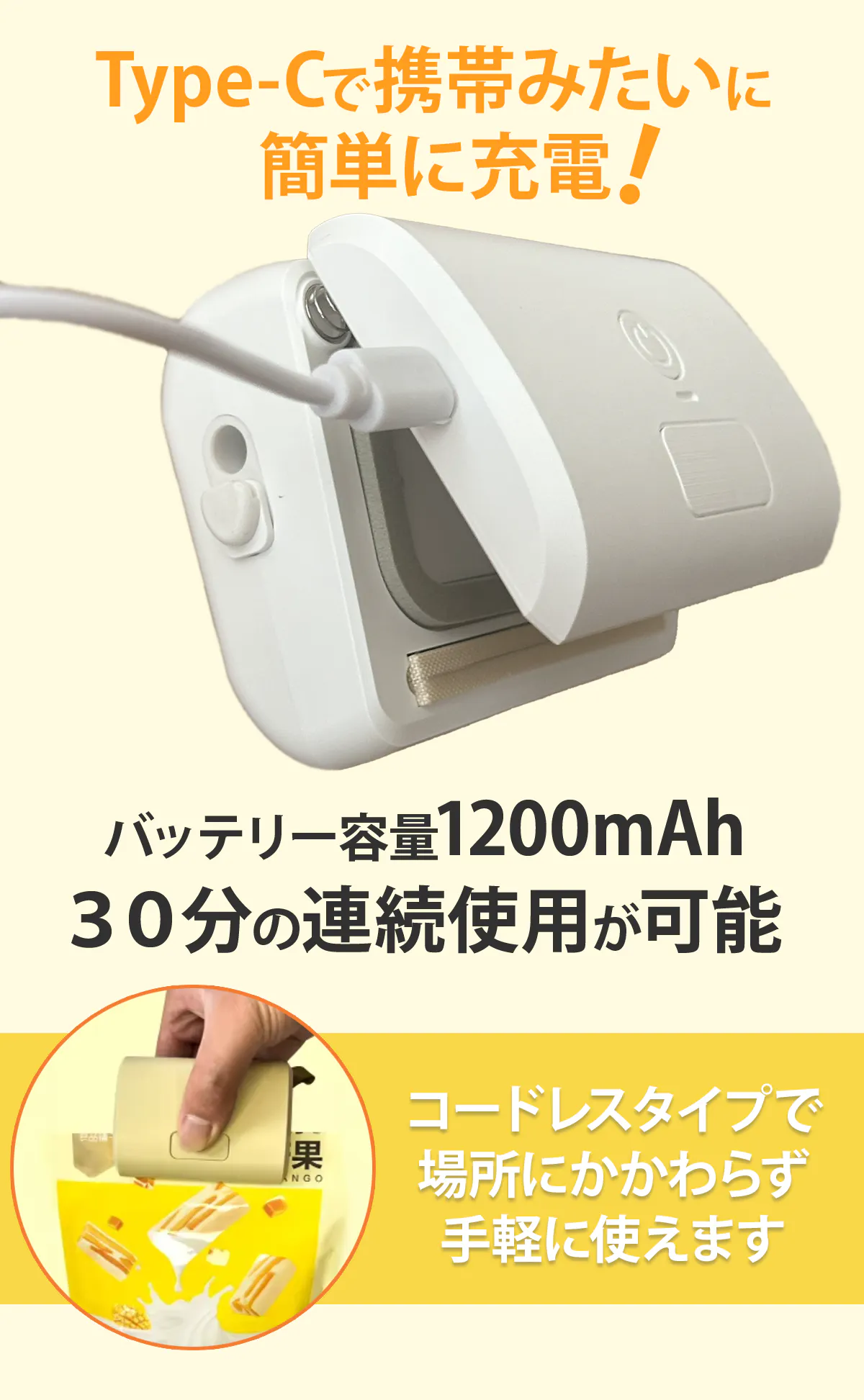 Sealer Vacuum 1.0のサイズは90x70x51mmで、重さはわずか200g。これは一般的な真空パック機の1/10のサイズです。