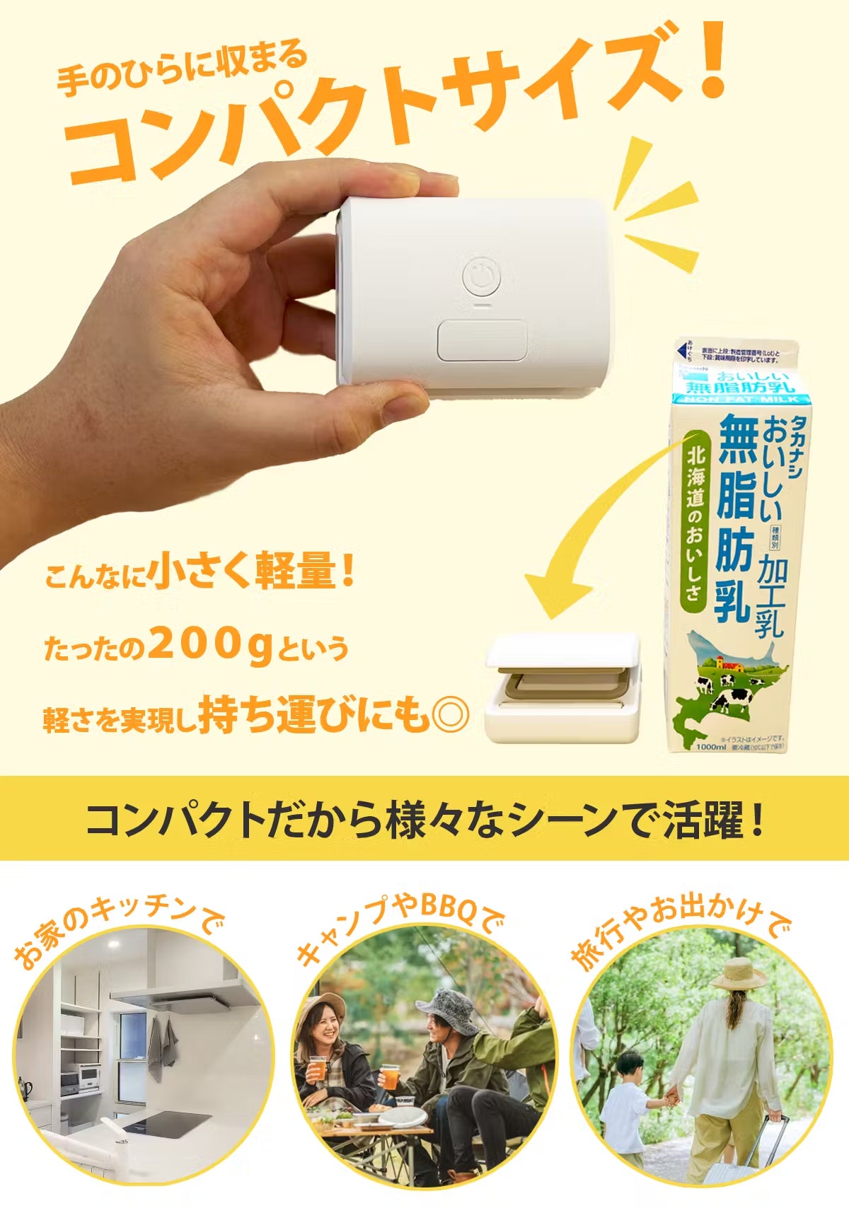 「Sealer Vacuum 1.0」は、手のひらに収まるコンパクトなサイズながら、強力なバキューム機能と多彩な使い道で、アウトドアや旅行をさらに楽しく、快適にしてくれる頼もしい相棒です。食材の鮮度保持から、ボールや浮き輪の空気入れ、布団の圧縮まで、この1台で多くのシーンに対応できます。キャンプや旅行の準備が一層簡単に、収納もスマートに。