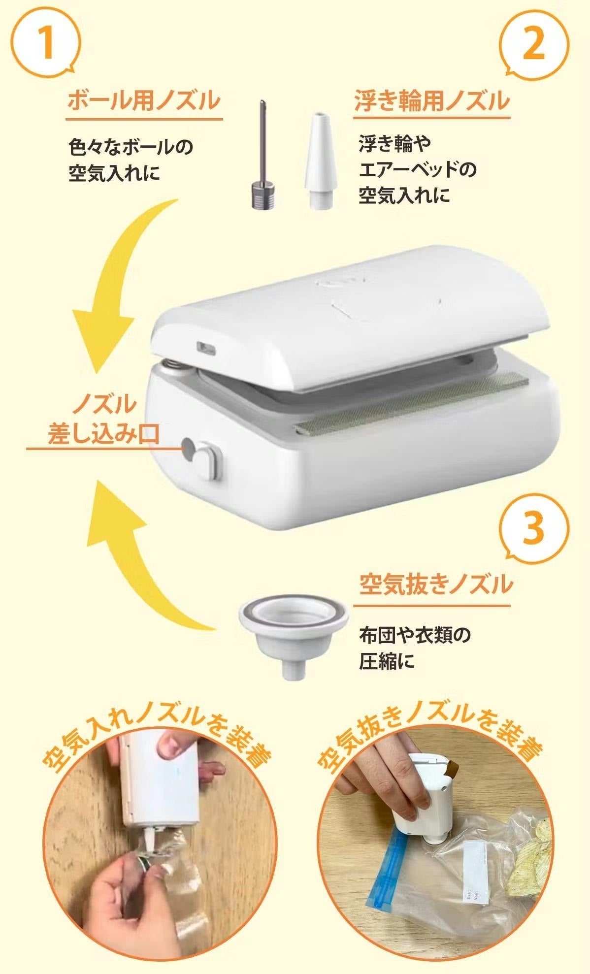 次に、「空気抜きノズル」ですが、これは布団や衣類の圧縮保存に大活躍します。従来の大きな圧縮袋専用のポンプや掃除機を使って空気を抜く方法は手間がかかり、特に旅行や出張の際には不便でした。しかし、このSealer Vacuum 1.0なら、軽量でコンパクトな本体を持ち運び、必要な時にすぐに圧縮作業が可能です。旅行の準備が簡単になるだけでなく、出張先でも限られたスペースを有効活用できるようになります。