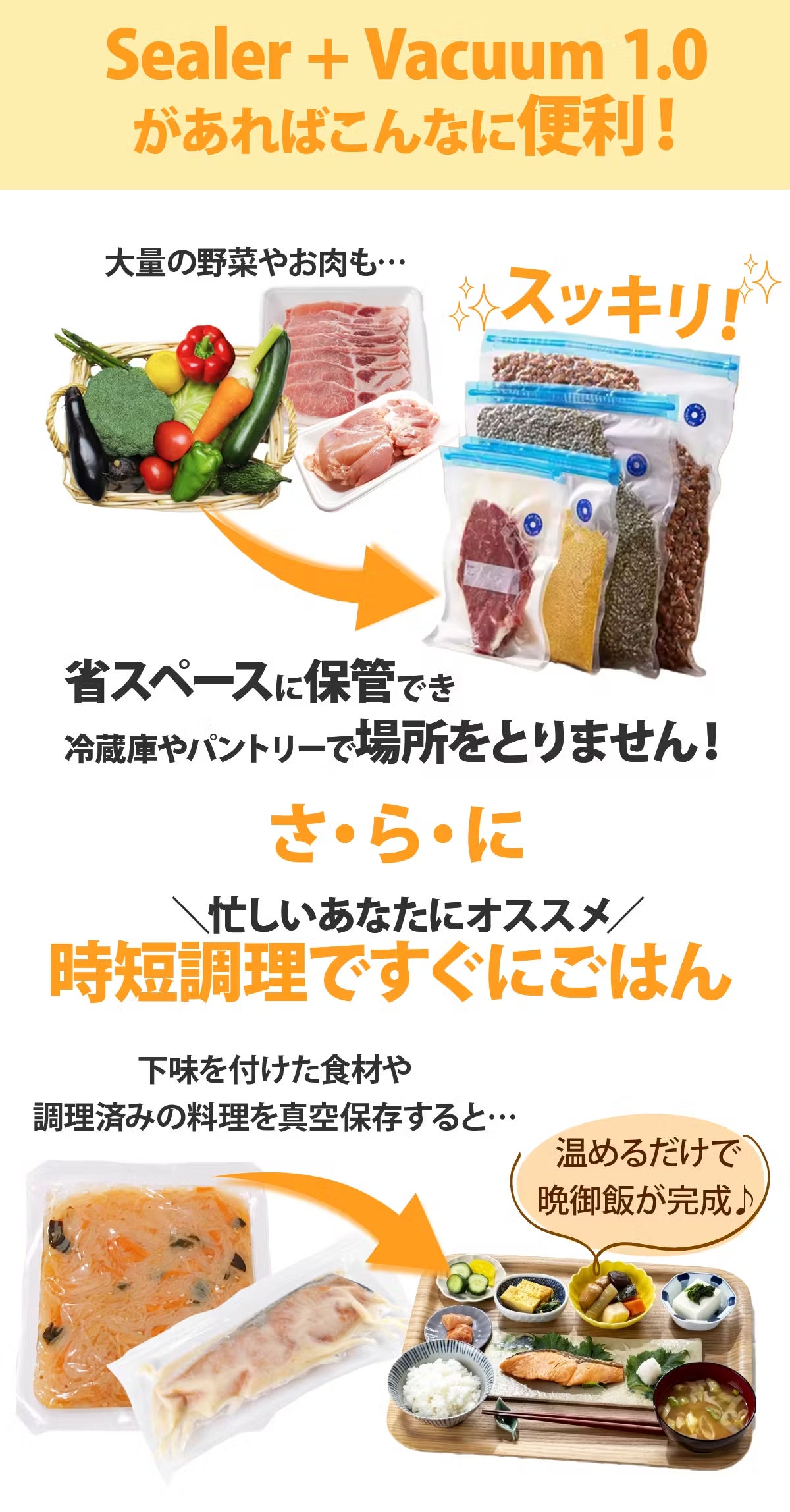 さらに、真空保存した食材は調理の際にも便利です。調理済みの料理や下ごしらえ済みの食材をパックしておけば、忙しい朝や仕事帰りでもすぐに食事の準備ができるので、時短にもつながります。これにより、忙しい生活の中でも健康的な食事を手軽に楽しむことができます。
