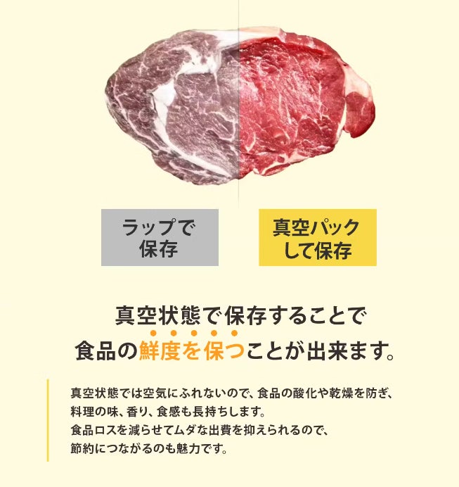 Sealer Vacuum 1.0は、通常の保存方法と比べて、食品の鮮度を格段に長持ちさせる優れた保存方法です。特に、肉や魚、野菜などの生鮮食品やスナック、ドライフルーツなどを新鮮な状態で長く楽しみたい方におすすめです。食品の廃棄を減らし、長期間美味しさを保つための革新的な方法として、真空保存をぜひ試してみてください。