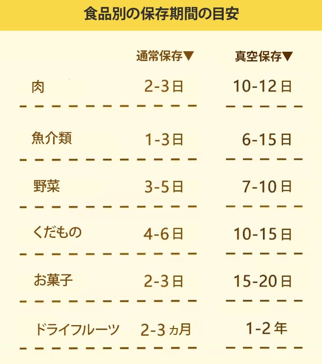 製品の詳細には、Sealer Vacuum 1.0が食品の保存期間をどれほど延ばすことができるかを示した便利なチャートも付いています。以下はその例です。