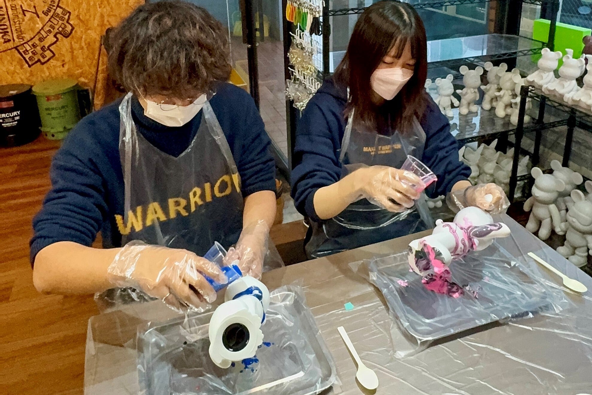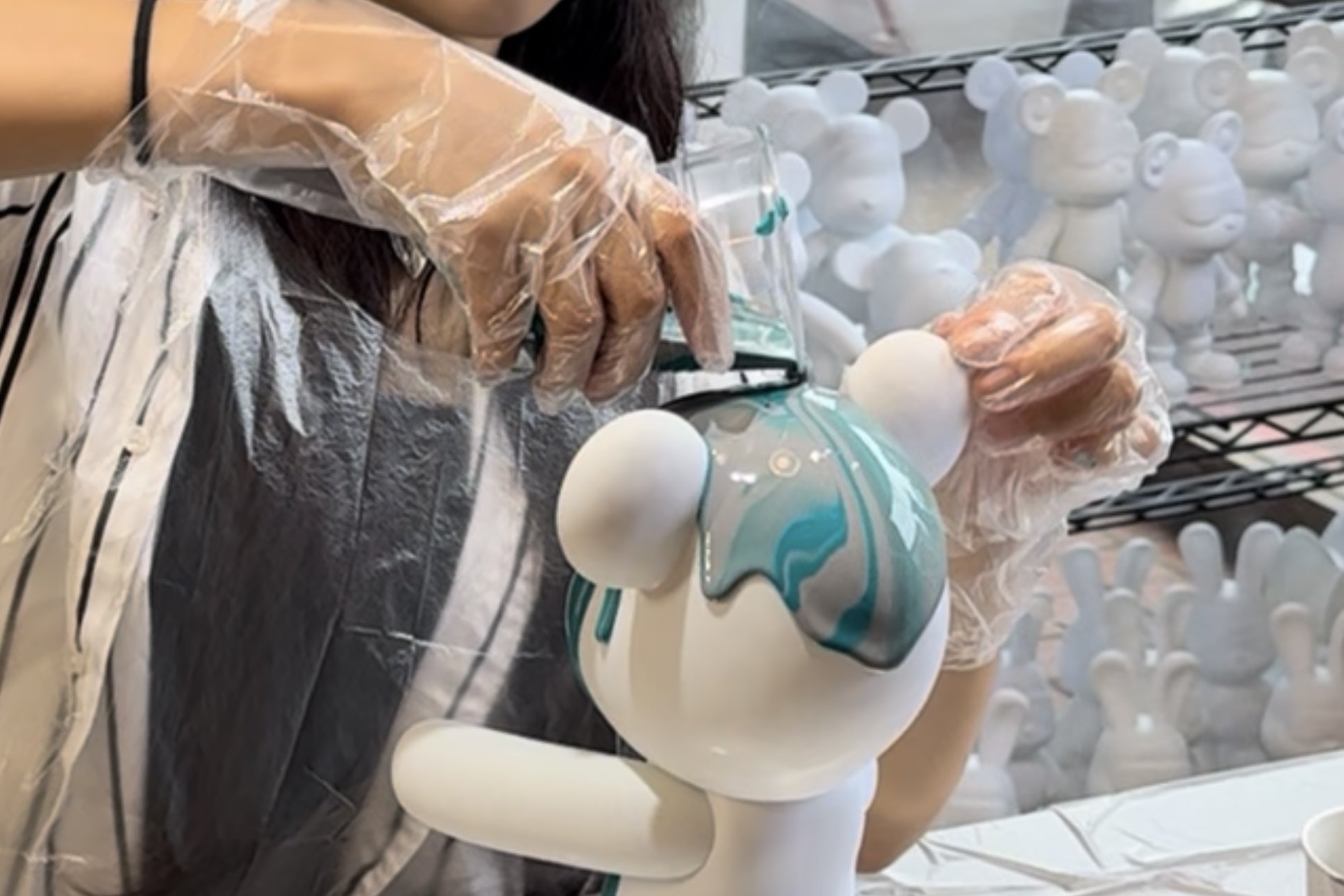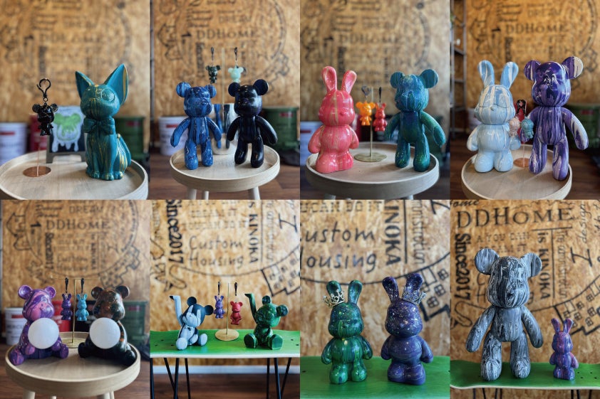 クマやウサギなどの様々な形のフィギュアに特殊な塗料を混ぜたインクをかけて