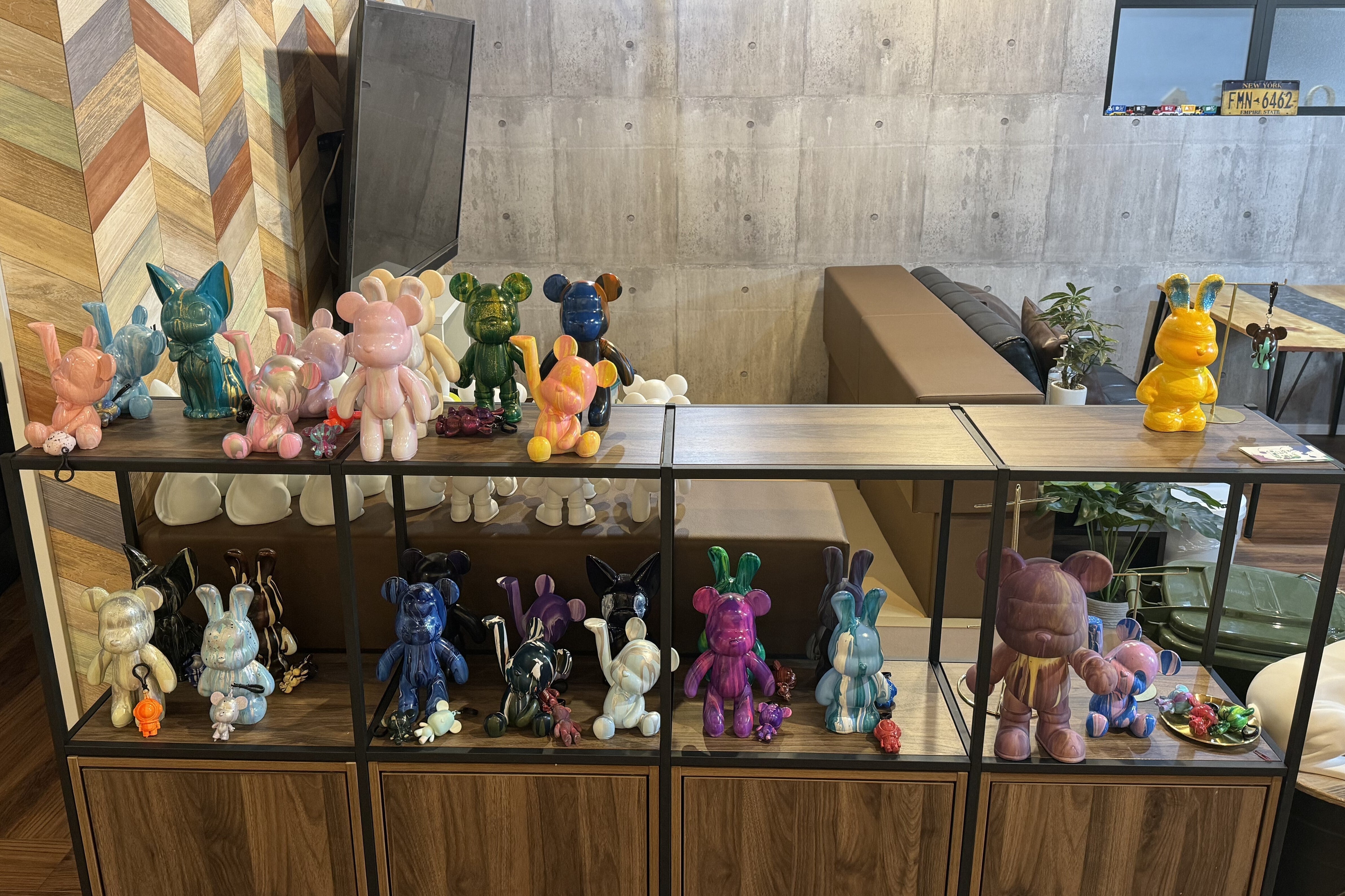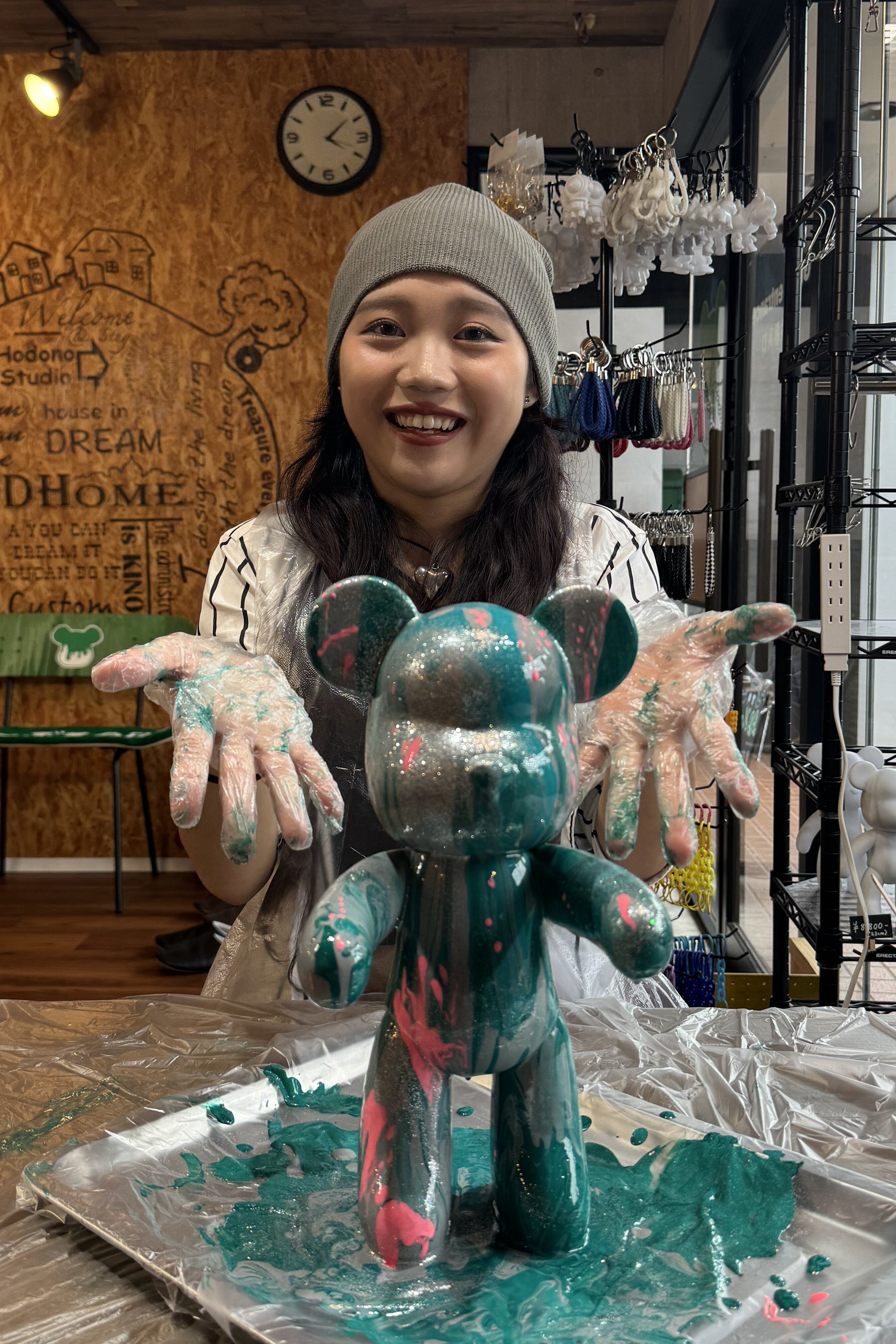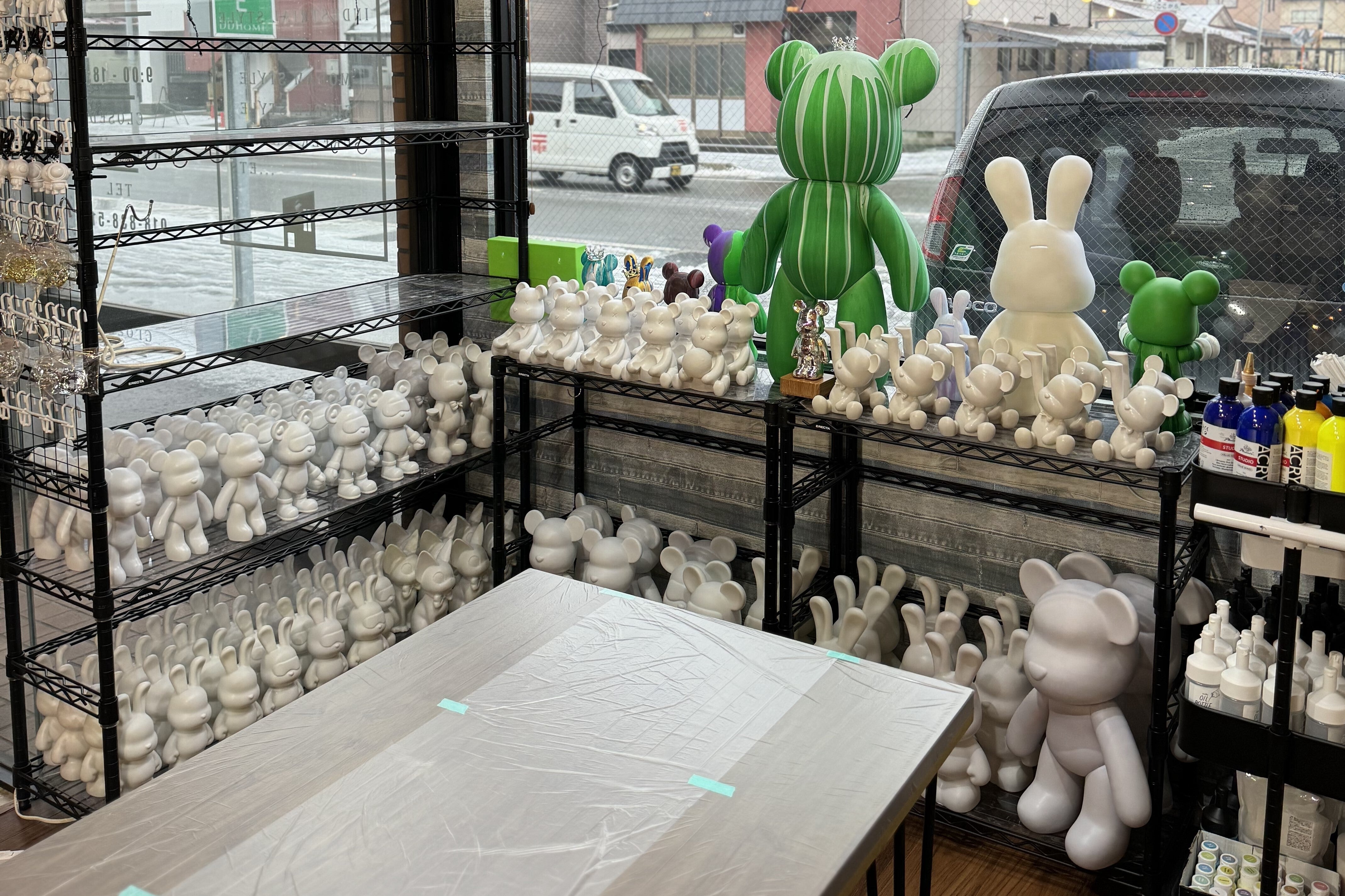 クマやウサギなどの様々な形のフィギュアに特殊な塗料を混ぜたインクをかけて
