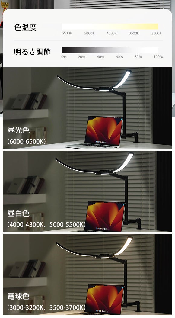 ・自動感光モード搭載・色温度調節・無段階調光可能
