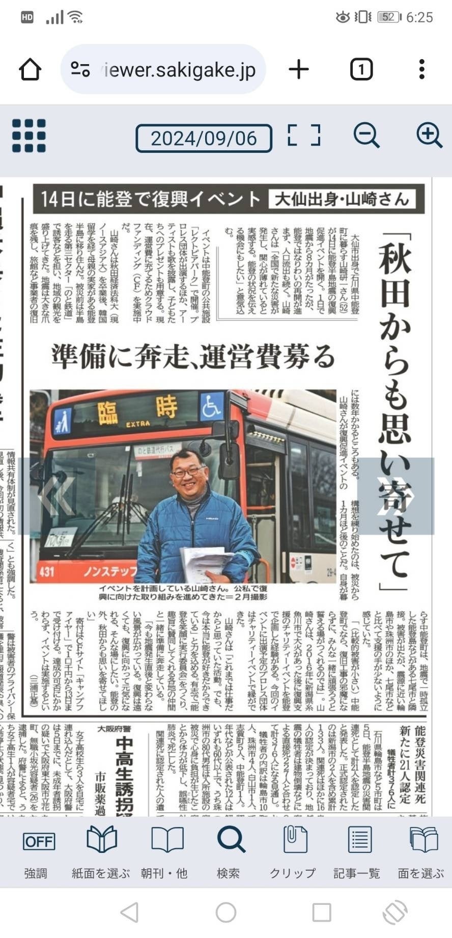 今日、小さい頃から学生時代の大半を過ごした故郷、秋田の秋田魁新報さんに記事を載せて頂きました。生まれは石川県七尾市。里帰り出産の為。そして育ったのは花火の町、秋田の大曲。小さい頃から故郷ってどこなんだろう?って考えてました。今は故郷は秋田だなと思ってます。故郷は遠くにありて思うもの。室生犀星が書いた一部だったと思いますが。そして、震災が有ってたまたま記者さんと知り合い記事に取り上げても頂きました。石川県で告知で動いていたら、マスコミの方に、あれ?山崎の顔がチラシに無いと言われました。私は芸人枠ではないので。と言われる位、色んな方々のおかげでマスコミに出させて貰って来ました。ちなみに私は主催者なんでチラシに出る必要もありません。プロレスのリングの都合がつかず、その日しかダメで雨天決行なんで台風、天気だけが心配です。資金はまだまだメド立ちませんが、最後までイベントを頑張ります。昨日もテレビ局で震災、震災後の話をして、今日もある方とメッセージのやり取りしながら涙を流しました。ある取引先の前担当者の旦那さんが震災直後、DMATで輪島入りして救援活動して下さった事に、自分が能登を代表してと言ったら傲慢かもしれないけど、能登の為にありがとうございました。とお伝え下さいと名古屋で話して来た話しでした。協賛して下さった方々、私の想いを拡散して下さった方々、告知活動を協力して下さってくれるマスコミの方々。当日、遠方から駆けつけてくれるる仲間達。成功させる義務は私にありますが、成功したら皆様のお力添えだと思っています。あと1週間。何卒、宜しくお願いします。