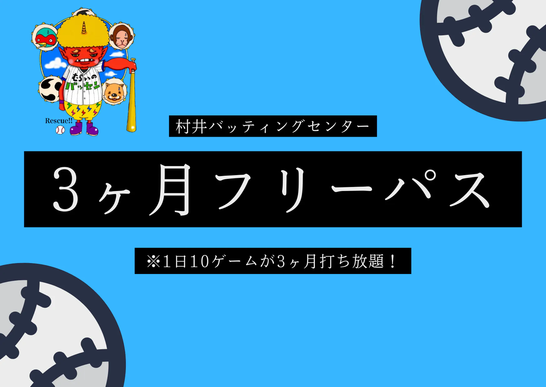 - 3ヵ月間好きなタイミングで好きなだけ村井のバッセンを楽しんでいただけるフリーパスをご用意いたしました。