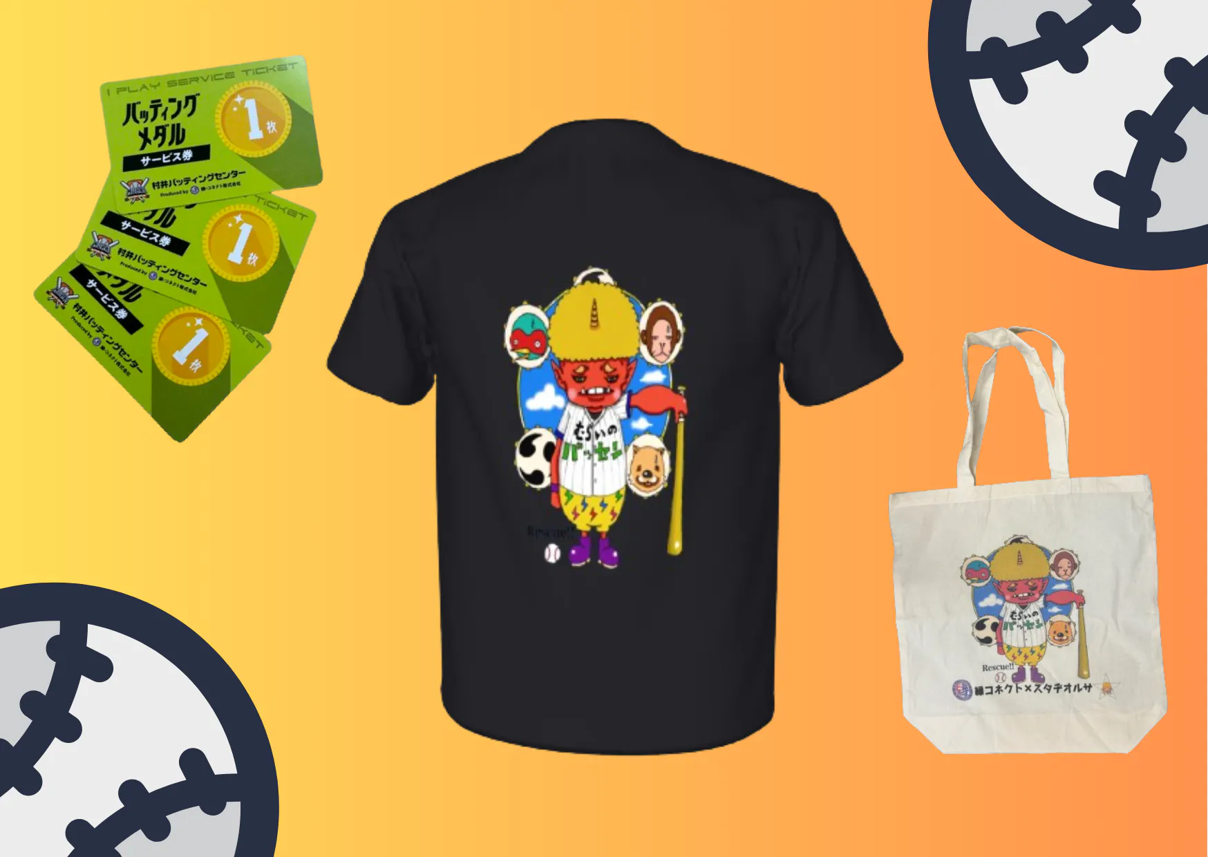 - バッティングセンターオリジナルキャラクターの「鬼村球太郎」を印刷したオリジナルTシャツをご用意しました。 私たちの感謝の気持ちを込めた一枚を、日常でお楽しみください。加えて10ゲームサービス券もセットにしました。