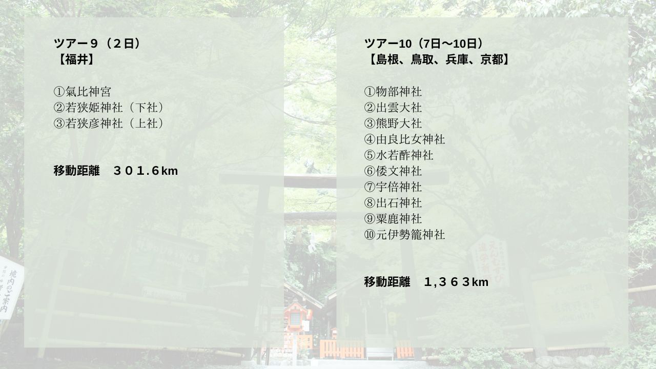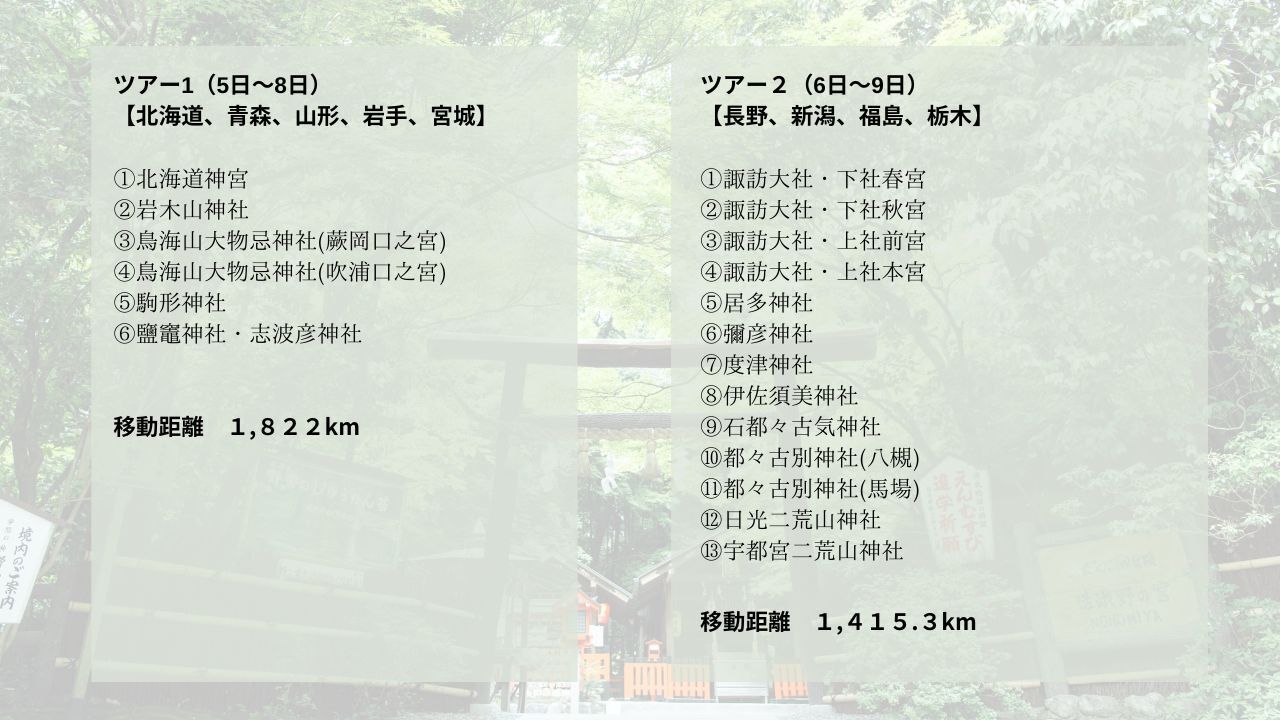 北海道、青森、山形、岩手、宮城、長野、新潟、福島、栃木、愛知、静岡、神奈川、千葉、茨城、埼玉、山梨、岐阜、三重、福井、奈良、和歌山、大阪、滋賀、京都、石川、富山、栃木、島根、鳥取、兵庫(下記ツアー行程1、2、3、4、5、6、7、8、9、10)