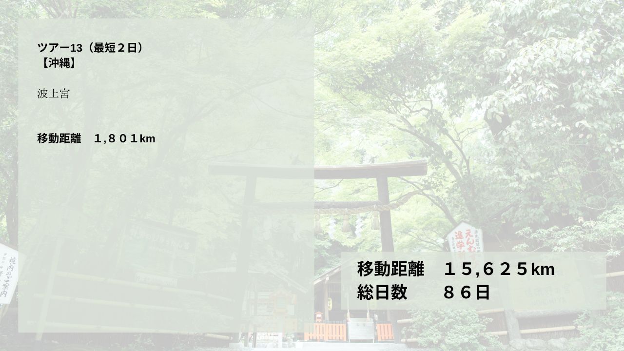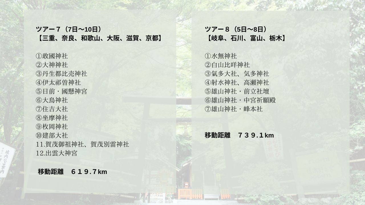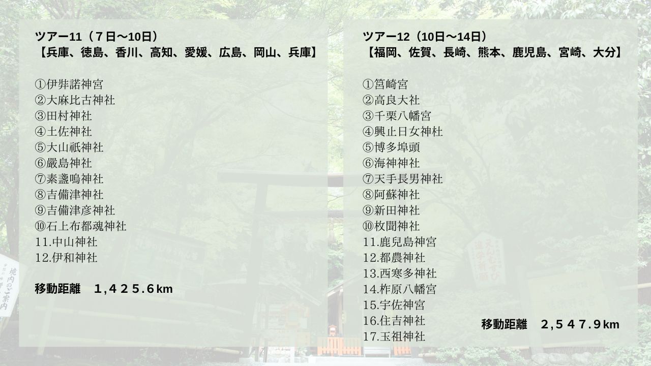 北海道、青森、山形、岩手、宮城、長野、新潟、福島、栃木、愛知、静岡、神奈川、千葉、茨城、埼玉、山梨、岐阜、三重、福井、奈良、和歌山、大阪、滋賀、京都、石川、富山、栃木、島根、鳥取、兵庫、徳島、香川、高知、愛媛、広島、岡山、兵庫、福岡、佐賀、長崎、熊本、鹿児島、宮崎、大分、沖縄(下記ツアー全行程1〜12)