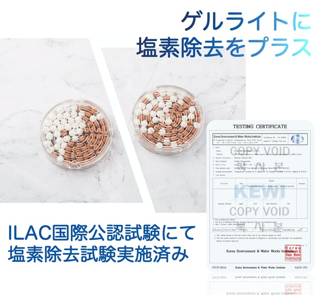 塩素除去フィルターは、塩素除去ボールとゲルライトをミックスすることで、従来のゲルライトフィルターの機能も充実させながら塩素除去も可能にしました。