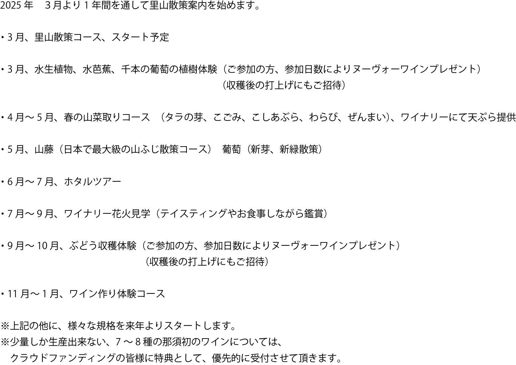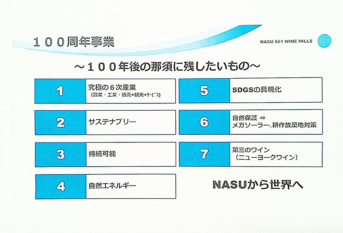 当社ワイナリーのサスティナブルな取り組みは、SDGsを念頭に、ワイン醸造・販売だけでなく「那須高原の新しい観光拠点化」と「6次化産業の推進」の役割を担っており、那須地域の多くの産業・企業が連携することで、地域全体の活性化につなげるとともに、このワイナリーが「100年先も残る居心地のいい空間」となることを切に願っています。そのためには、より多くの方に、知って頂くことが必要です。ぜひ、当社のプロジェクトにご協力お願いします!!