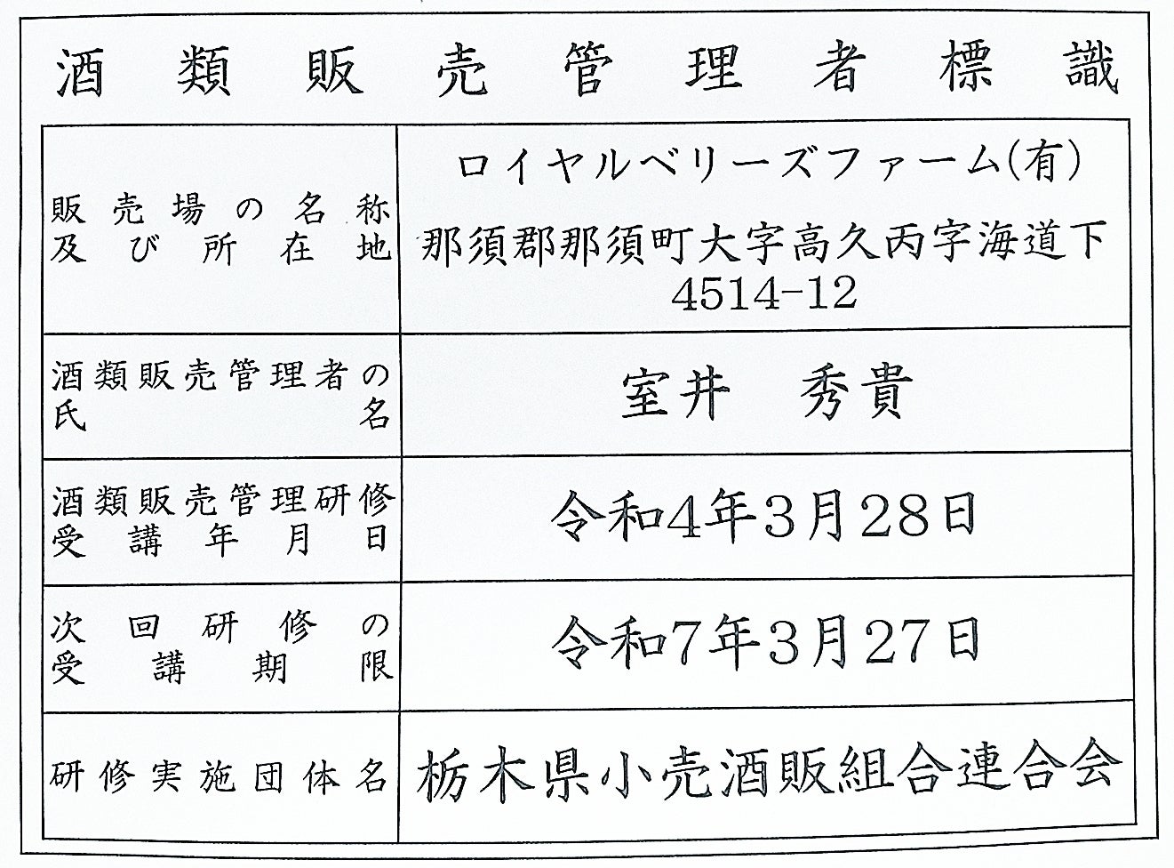 果実酒製造免許取得し、令和4年3月に酒類販売管理研修を受講