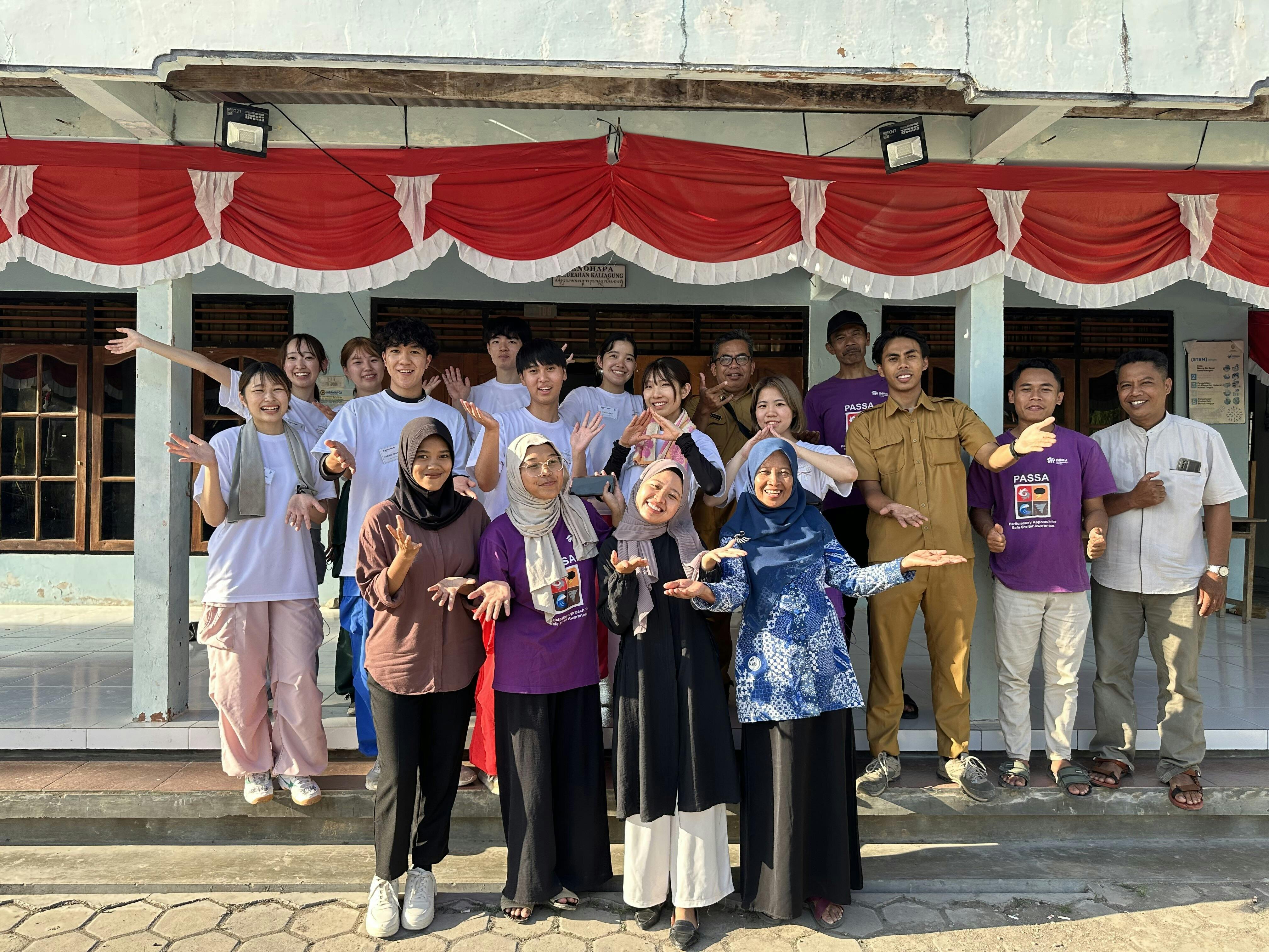 今日は普段のワーク日とは違って現地の方との交流会を行ないました。インドネシアも日本と同様地震による被害を多く受ける国であるということから共に防災に関して学びを深め、自身の身と周りの人を守れるようにと情報を交換しました。