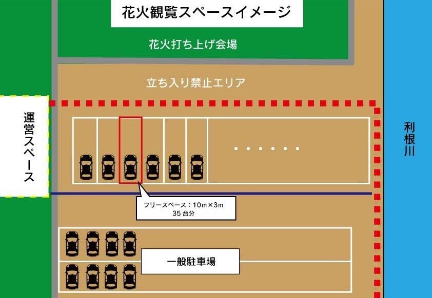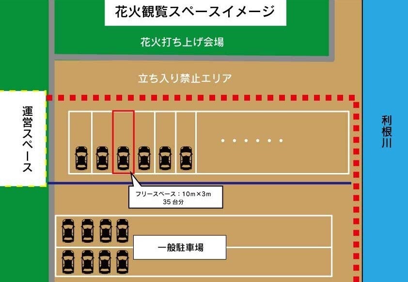 自家用車で会場に乗り入れ、決められたスペース内(下図の赤枠)で自由に観覧できるスペースです。間近で咲き乱れる花火は圧巻です。花火撮影愛好家の方にもお勧めです。打ち上げ開始は19時を予定しています。