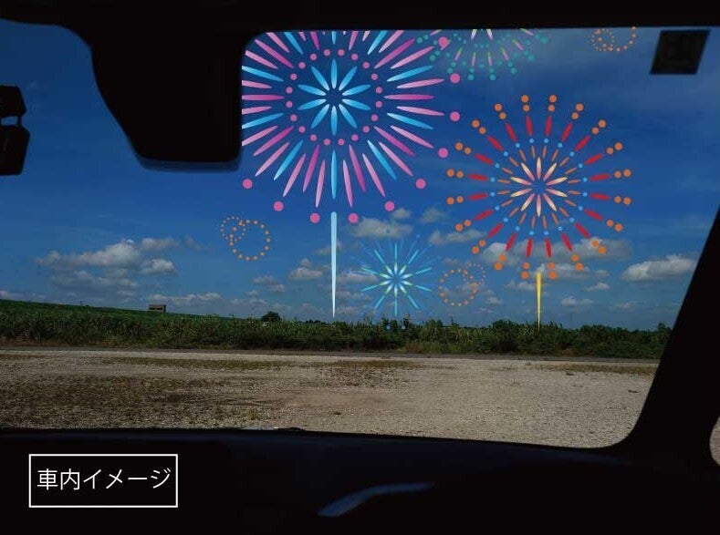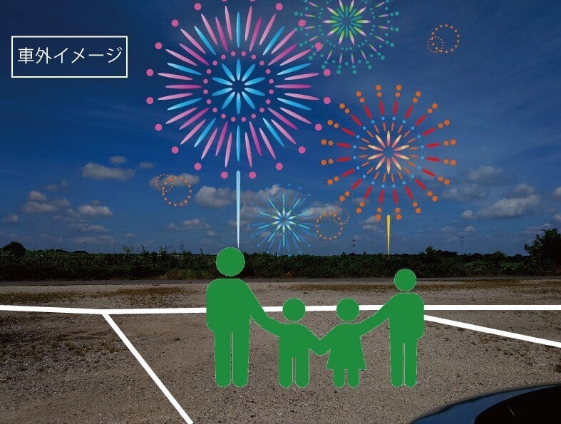 花火特別観覧スペース(普通自動車1台分)+Tシャツ1枚(綿、サイズS~2L)+フェイスタオル+ハンドタオル+ラバーコースター+案内状(※+動画URL)