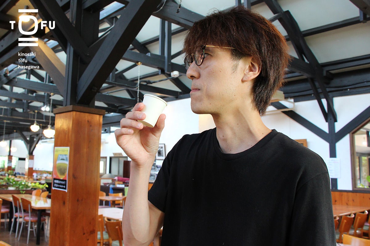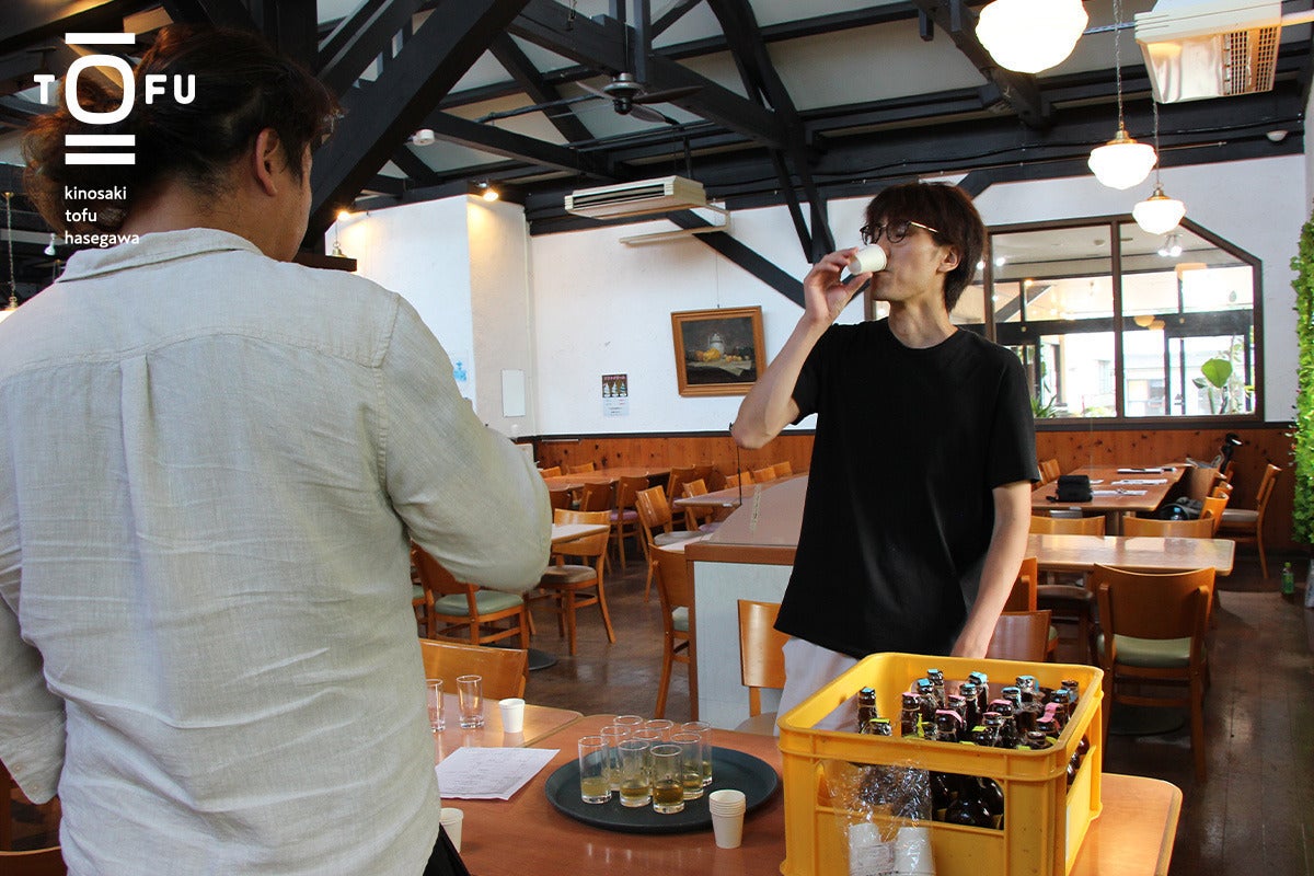 そんな中、商工会の青年部に参加し、出石城山ビールの奥村さんと出会い、「豆腐でビールが作れるのではないか」というアイディアが生まれ、日本初の豆腐ビール作りへの挑戦が始まりました。