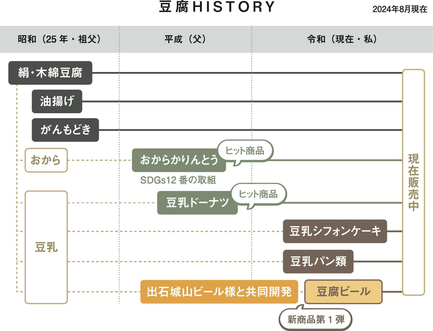 1998年(平成10年)頃から、スーパーやコンビニの普及に伴い、若者の豆腐離れが進み、売上が減少していました。この状況を打破するために、2003年(平成15年)から「おからのかりんとう」、2008年(平成20年)から「豆乳ドーナツ」を販売し、メディアにも紹介されるほどのヒット商品となりました。しかし、2020年(令和2年)以降のコロナ禍で客足が途絶え、売上が大幅に減少しました。