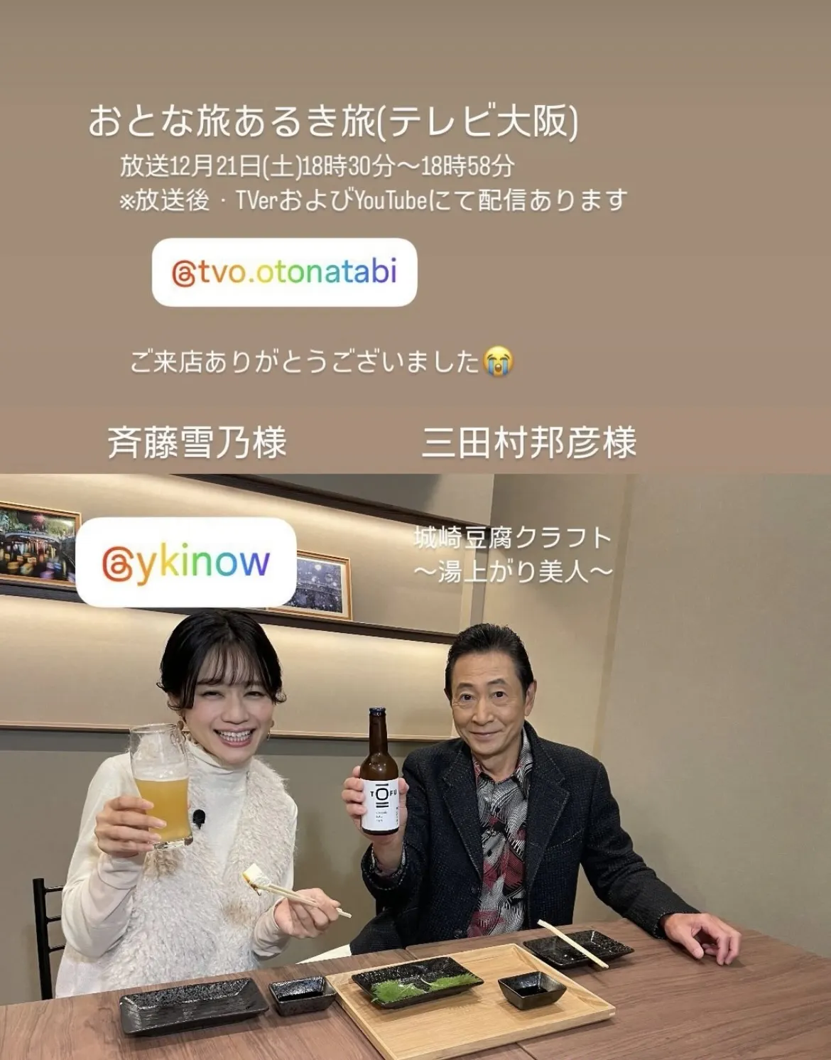 2024/12/20 23:22明日おとな旅あるき旅(テレビ大阪)にて豆腐クラフト取り上げて頂いた一部が映るかもです。是非見て下さいね。(ラベルが未完成だった為色々大変でした!笑)よろしくお願い致します。 もっと見る