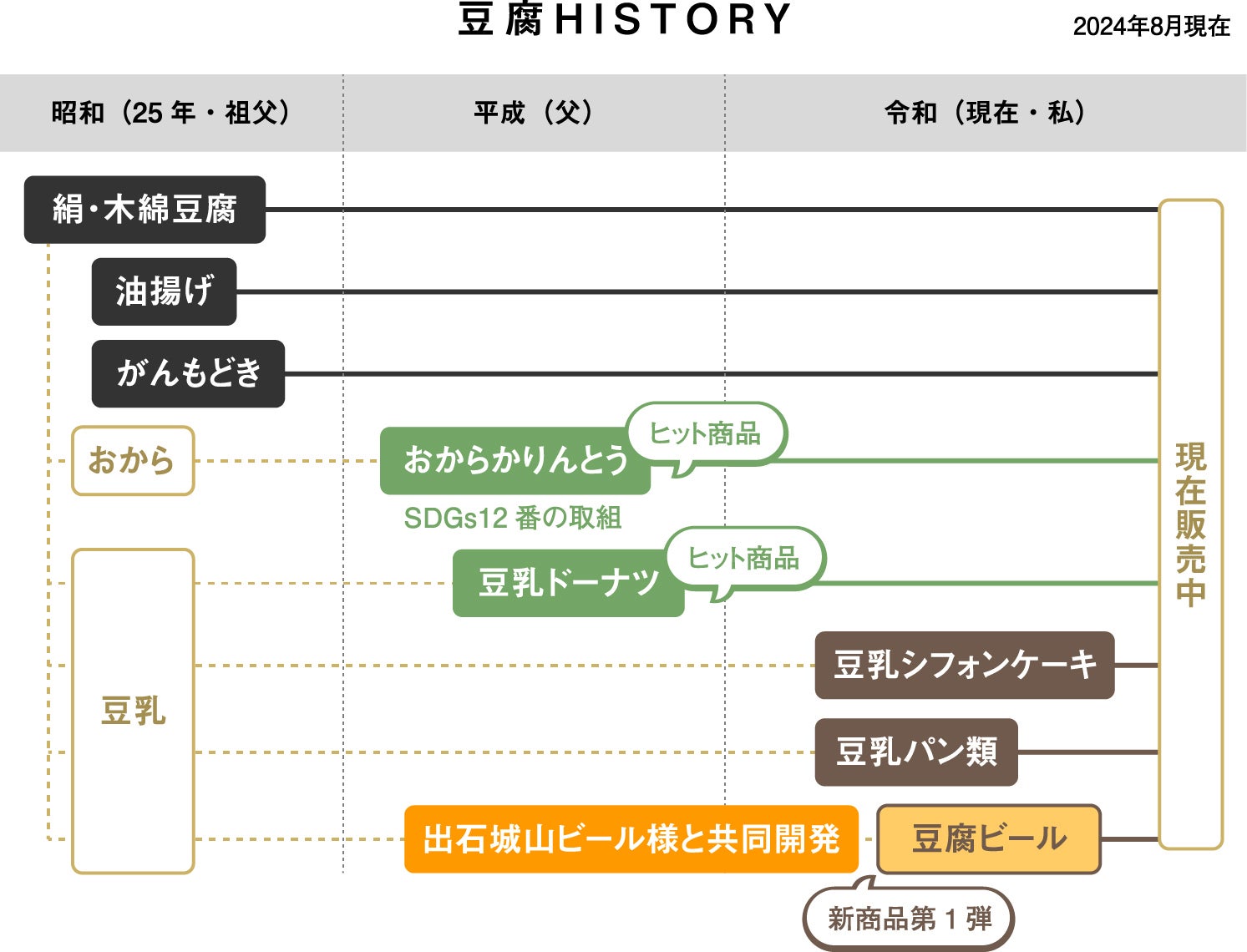 1998年(平成10年)頃から、スーパーやコンビニの普及に伴い、若者の豆腐離れが進み、売上が減少していました。この状況を打破するために、2003年(平成15年)から「おからのかりんとう」、2008年(平成20年)から「豆乳ドーナツ」を販売し、メディアにも紹介されるほどのヒット商品となりました。しかし、2020年(令和2年)以降のコロナ禍で客足が途絶え、売上が大幅に減少しました。