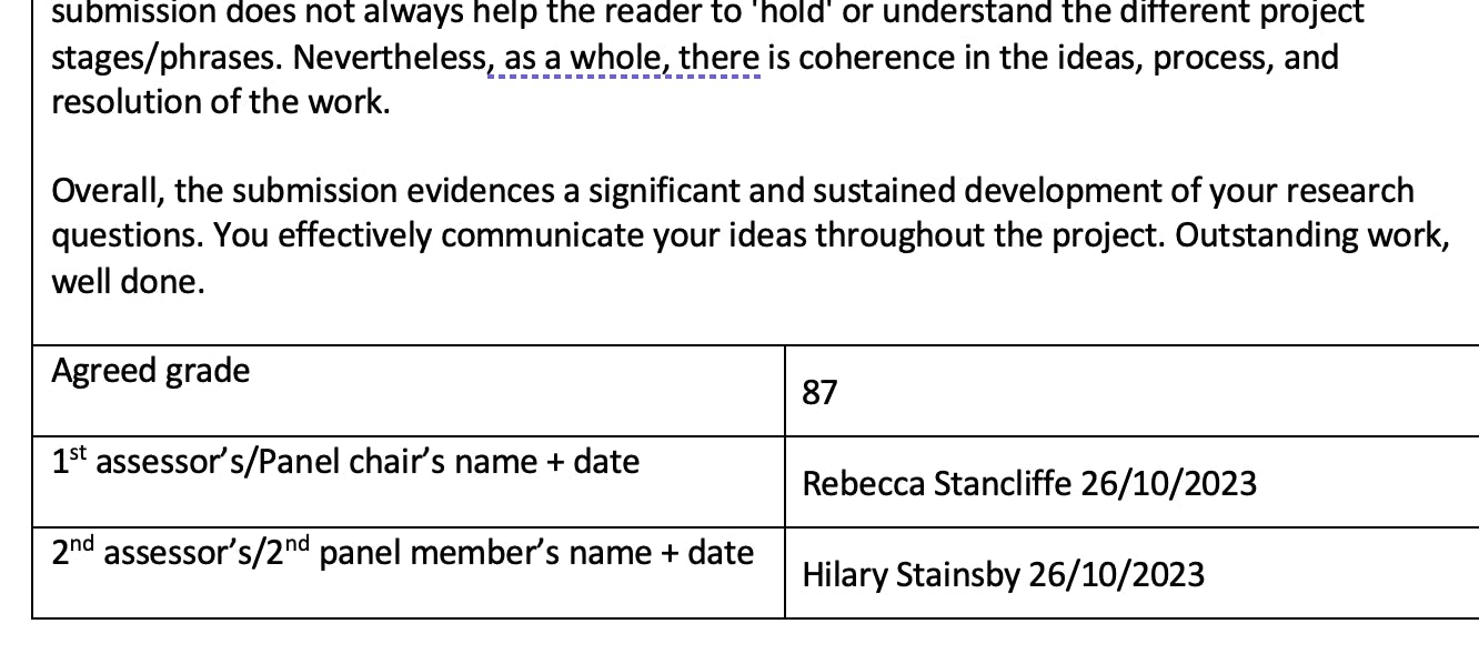 私はこのようなリサーチ活動の結果としてコンタクトインプロビゼーションに関連した自身の研究(実際にはコンタクトインプロビゼーションとテクノロジーに関連した研究)し、ロンドンの大学院で、UKレベル7の評価基準に基づき、2023年に87(Distinction:優秀)の成績を獲得しました。これは最高評価の一つであり、非常に優れた成果を示すものです。この評価は、学生が非常に高いレベルで知識や理解を示し、独創的で深い分析を行い、高度な独立した研究結果であったことを示します。
