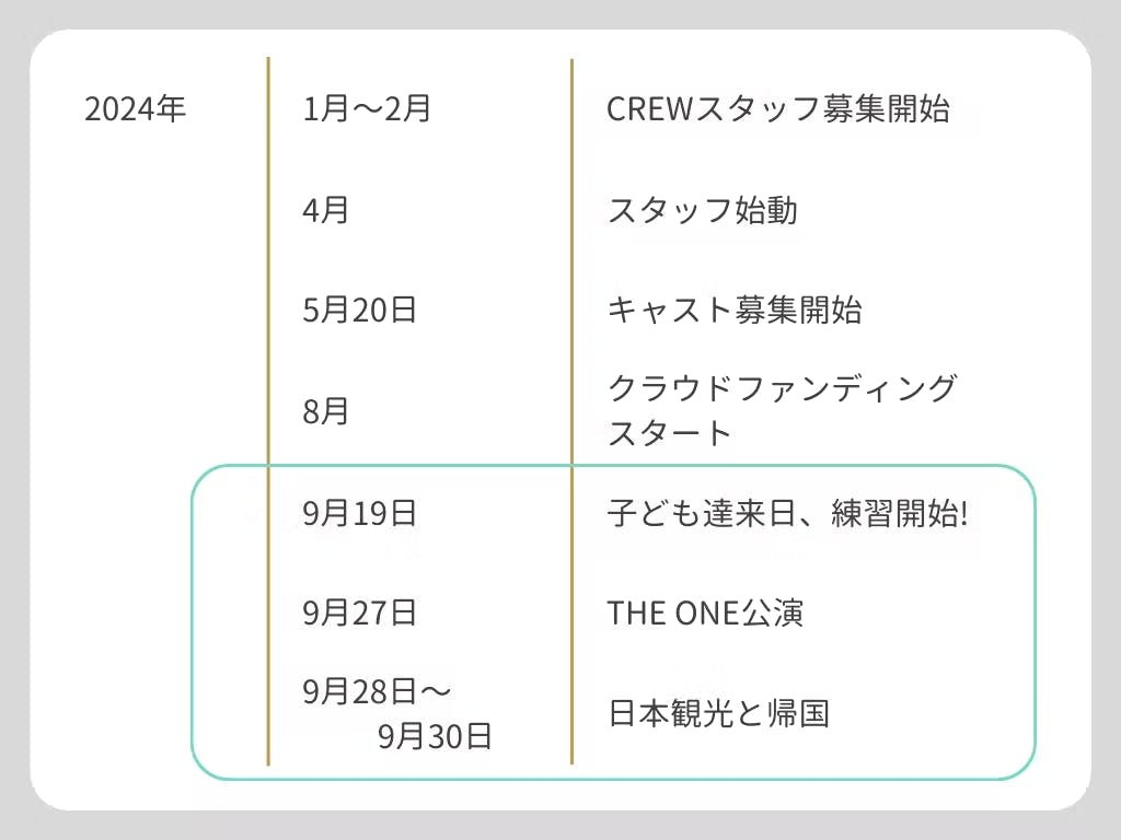 人生で始めてパスポートを取り、人生で始めて国際線に乗りやってくる子ども達が何を見て、何を感じるのか。そしてその子ども達の生み出すパフォーマンスに私たちは何を感じるのか蓋を開けてみるまで分からない、最高のステージの幕が上がります。一緒にこのTHE ONEを実現させてください!