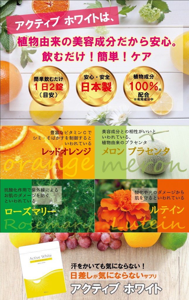 紫外線対策に有効といわれている、ビタミンC。そのビタミンCが普通のオレンジより豊富なイタリア産のレッドオレンジ抽出物を中心に、メロンプラセンタ、ローズマリー、ルティン、ローズヒップなど、植物由来の美容成分をサプリメントにしました。