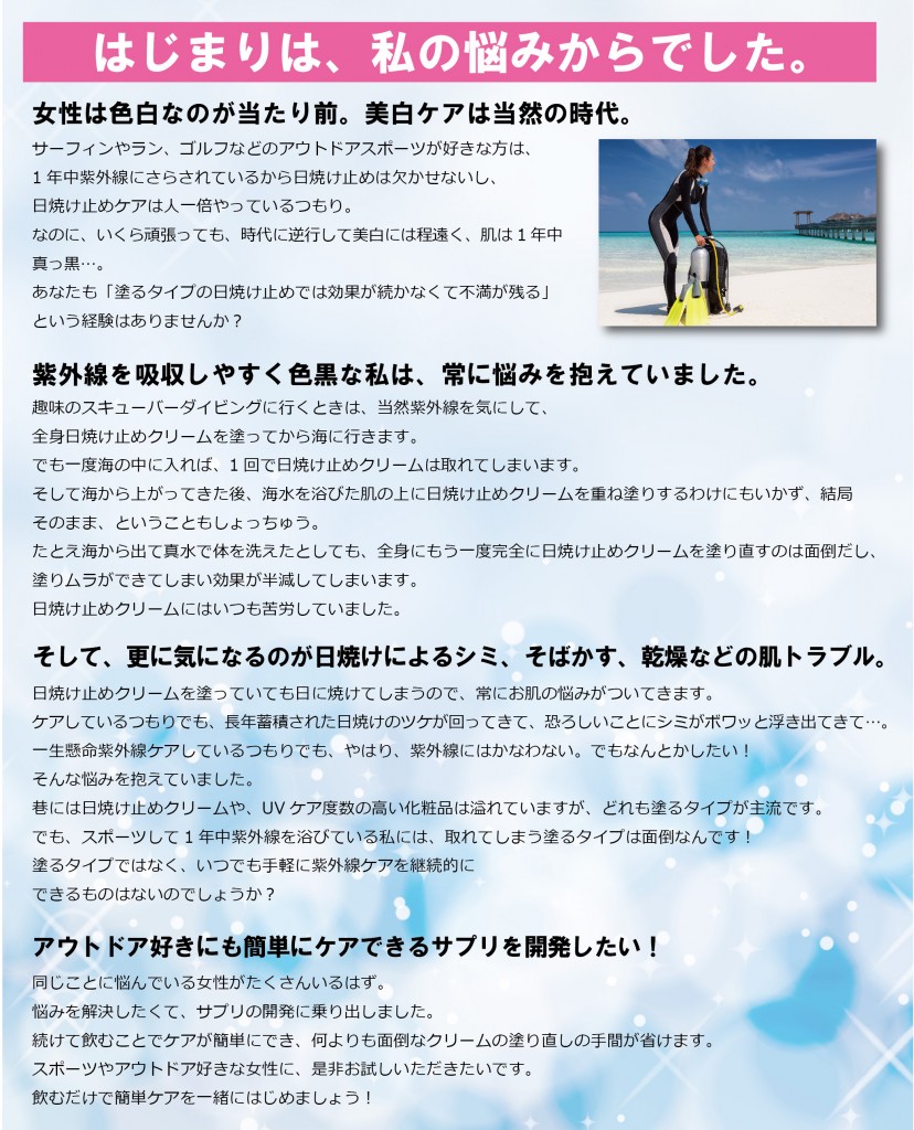 私も日焼け止めの塗り直しがこまめにできないマリンスポーツが趣味なので、海に行く度に「何か日焼けが気にならない簡単ケアはできないかな?」と考えていました。