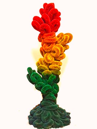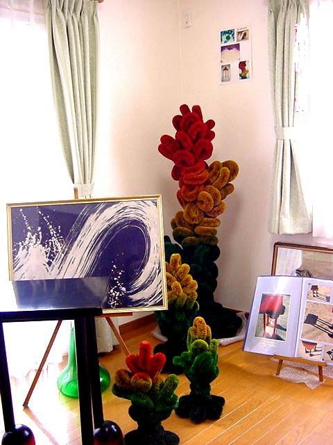 〔世界デザイン博(名古屋)傑作デザイン大賞展出展作及び指揮者の方の音楽教室ロビー設置作の同傾向創品〕シュロ製亀の子だわし100個を使用。木製ツリー状の基礎と木製円形プレートに、タワシを逆回転したものをスチール細線で取り付け構築。