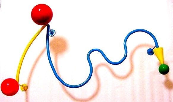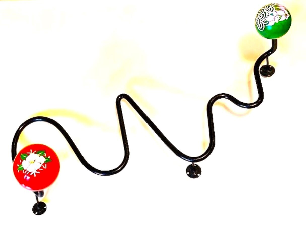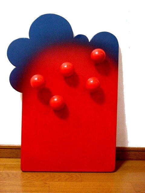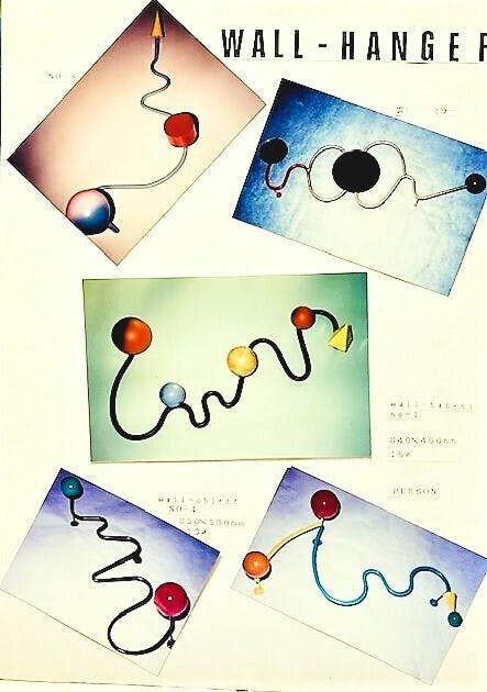 ウオールハンガー:スチールパイプと木製幾何形体2点で構築。
