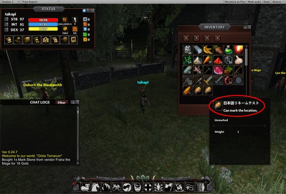 このゲームのアイテムには、任意の場所を記憶するための石(Mark Stone)があるのですが、場所を記憶させた石に好きな名前(日本語可能)を付ける機能を追加しました。この機能により、どの石にどの場所を記憶させたか、自分で書き留めておくことができるようになりました。今後も、便利機能を追加していこうと思います。(^-^