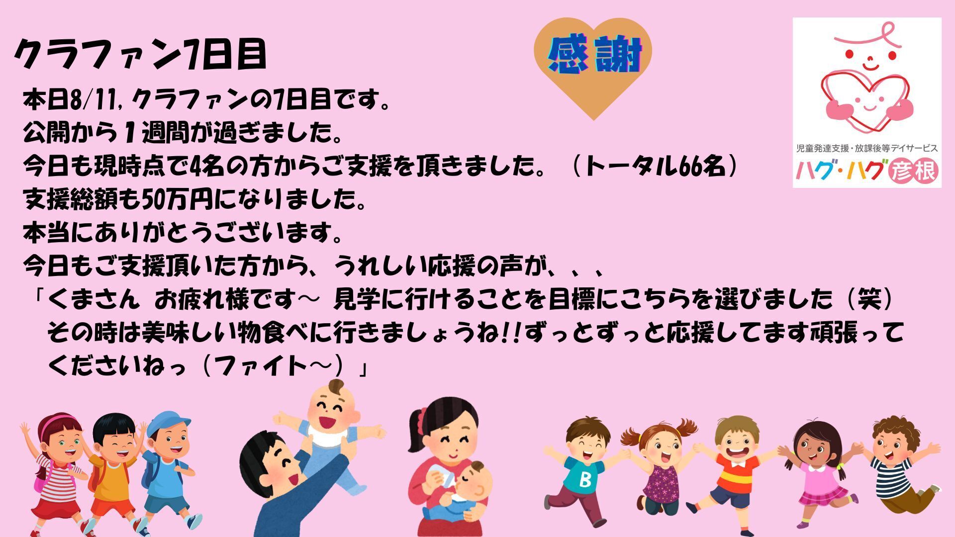 クラファン最終3日!皆様の温かいご支援に心から感謝を込めていつも応援してくださっている皆様へクラウドファンディング、残すところあと3日となりました。 目標金額は高く設定したため、達成率は低い状況ではありますが、 すでに113名もの方にご支援いただけたこと、心から感謝しております。皆様からの温かいメッセージや応援コメントは、 私の大きな励みとなり、このプロジェクトを最後までやり遂げようという気持ちを さらに強くしてくれました。本当にありがとうございます。心から感謝申しあげます。正直、目標達成は厳しい状況ではありますが、 皆様とのつながりを大切にし、このプロジェクトを成功させたいという気持ちは変わりません。残り3日間、最後の最後まで諦めずに、 周囲の方々にこのプロジェクトのことをお伝えいただけたら幸いです。皆様のシェアや拡散が、プロジェクトの成功につながります。 何卒よろしくお願い申し上げます。児童発達支援・放課後等デイサービス 「ハグ・ハグ 彦根」代表 山極孝司