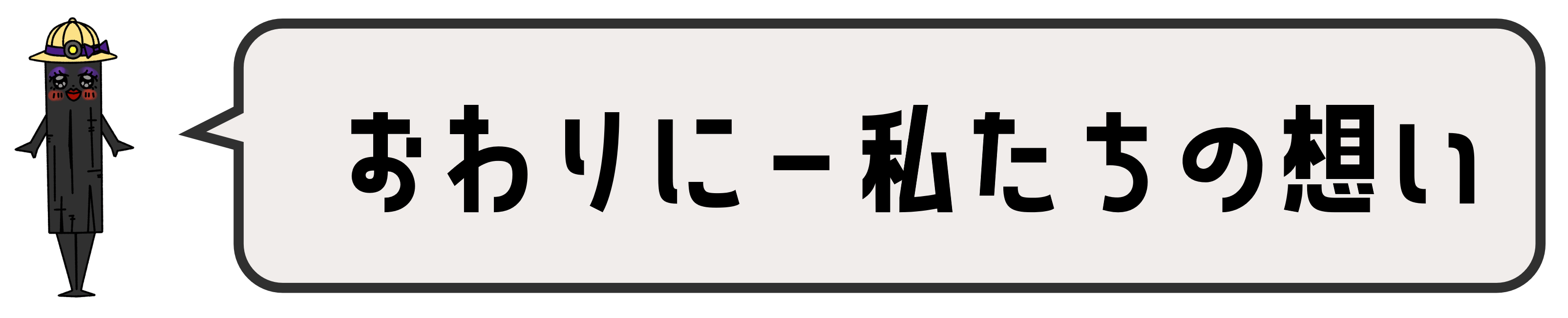 - 私たち自身、普段は、社会の環境をただ受け入れて不満を言うことが多いですが、自分の行動でモノゴトを変えることができる、という実感を持てるように成長していくため頑張っていきます。