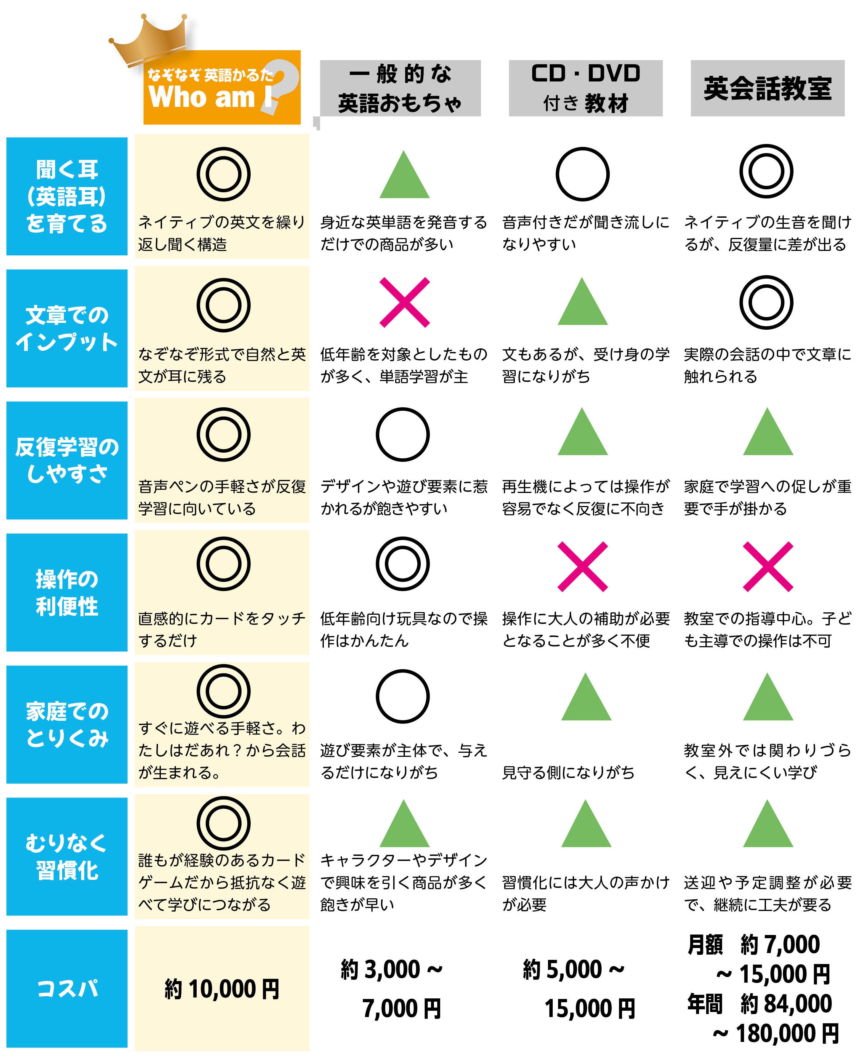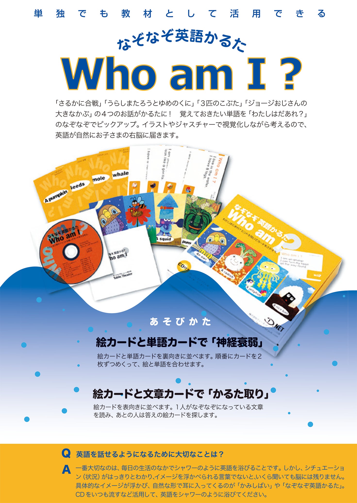 CD付きの英語教材「なぞなぞ英語かるたWho am I?」としては文科省の副教材にご提案いただいたこともあったり、細く長くではありますが、学校教材カタログを通じていまでも多くのご家庭や教室でご愛用頂いております。