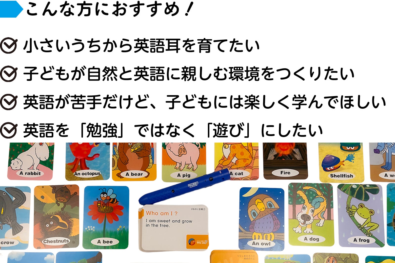 また、単語だけでなく意味のある文章を聞かせることで、脳に「英語を受け止める素地」を作れます。音声ペンの導入により、子どもたちはカードをタッチするだけで好きな文章をすぐ聞けるので、自然と英語の文章に集中できるようになりました。これが「なぞなぞ英語かるた Who am I?」を理想的な英語耳育成教材にしています。