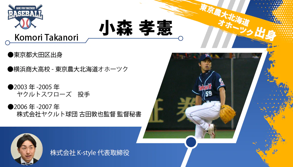 私は東京農⼤北海道オホーツク→ヤクルトスワローズ(2003年-2005年)でピッチャーとしてプレーしてきました。