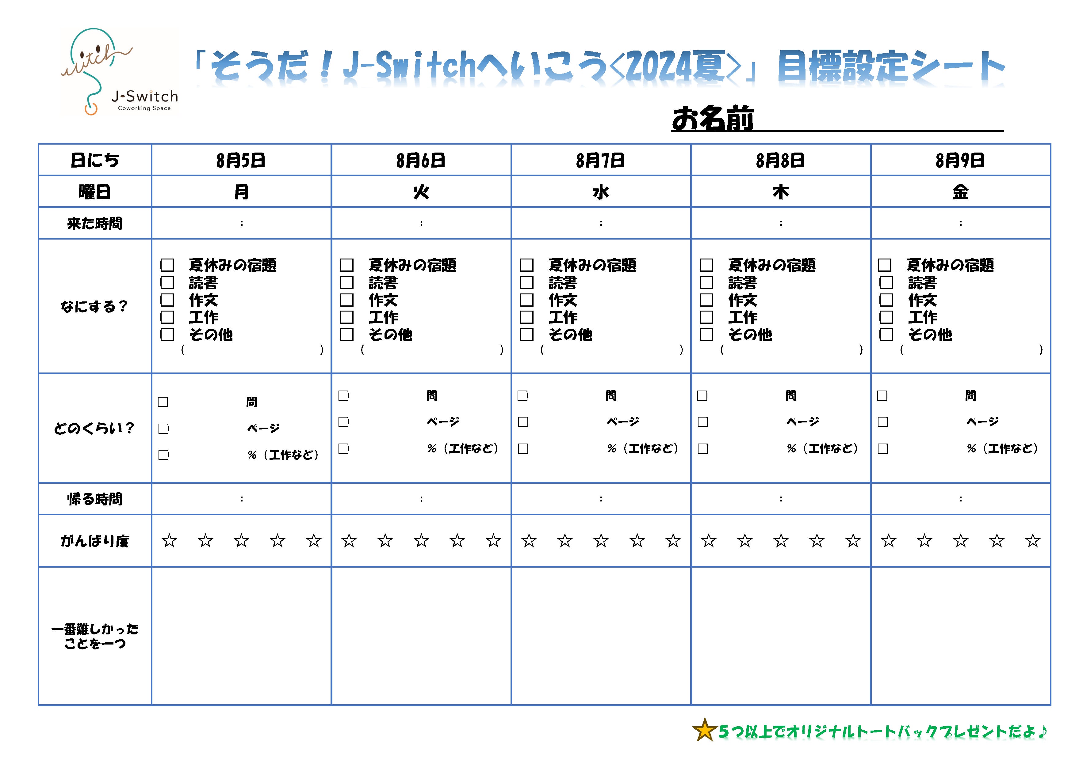 2024/07/30 13:03簡単な自己目標設定シートを作成しました。来場した時に、時間と何をどのくらいJ-Switchで行うのかを設定してもらい、帰るときに自己評価を☆の数で塗ってもらいます。今日の作業の感想を含めて振り返りの一言を書いてもらって一日終了です! もっと見る