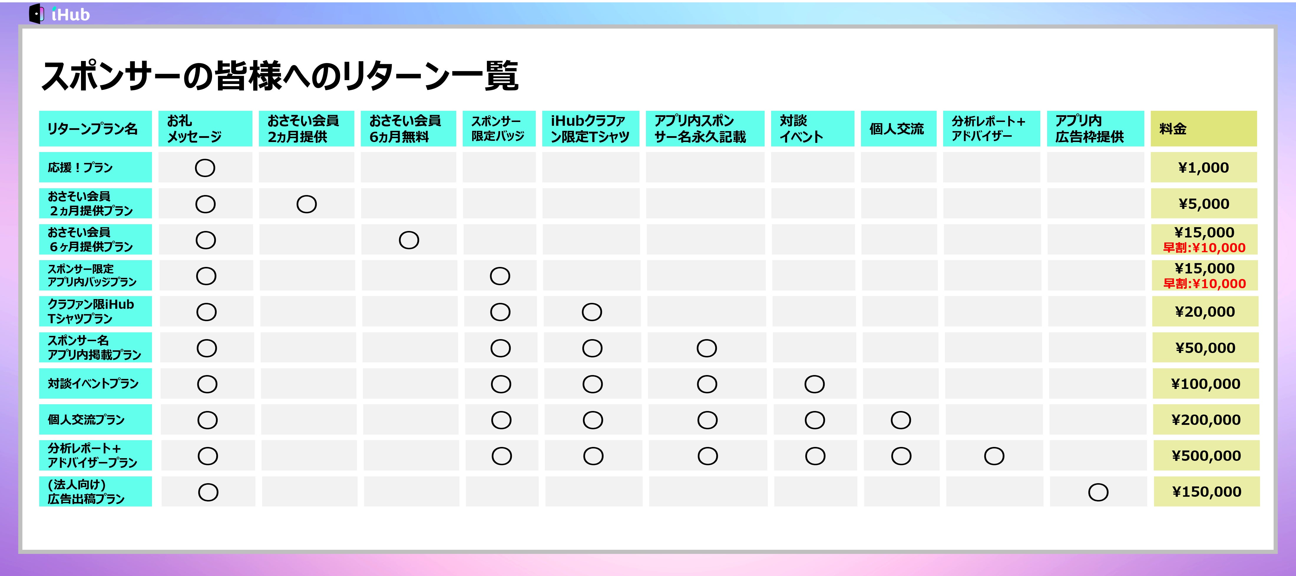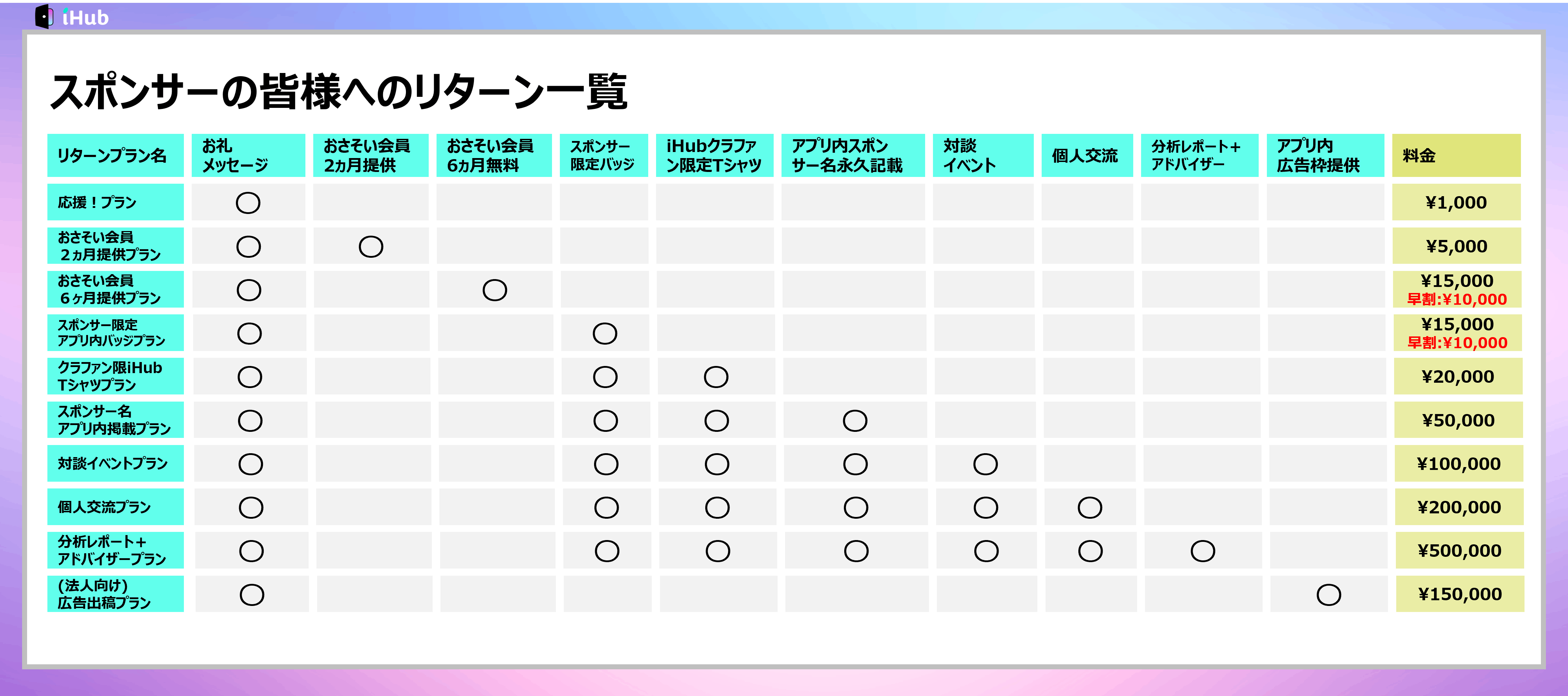 『iHub』では、支援者の皆さまに様々なリターンをご用意しております。詳細は各リターンの紹介画面をご参照ください。